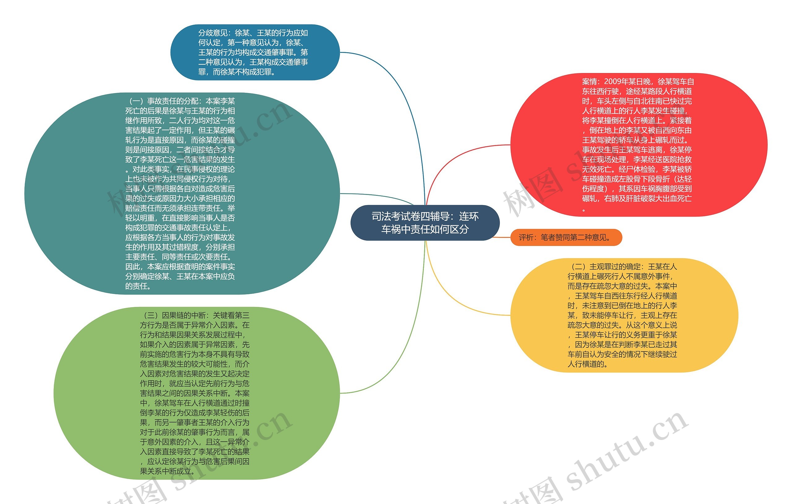 (一)事故责任的分配:本案李某死亡的后果是徐某与王某的行为相继作用所致,二人行为均对这一危害结果起了一定作用,但王某的碾轧行为是直接原因,而徐某的碰撞则是间接原因,二者间接结合才导致了李某死亡这一危害结果的发生。对此类事实,在民事侵权的理论上也未被作为共同侵权行为对待,当事人只需根据各自对造成危害后果的过失或原因力大小承担相应的赔偿责任而无须承担连带责任。举轻以明重,在直接影响当事人是否构成犯罪的交通事故责任认定上,应根据各方当事人的行为对事故发生的作用及其过错程度,分别承担主要责任、同等责任或次要责任。因此,本案应根据查明的案件事实分别确定徐某、王某在本案中应负的责任。