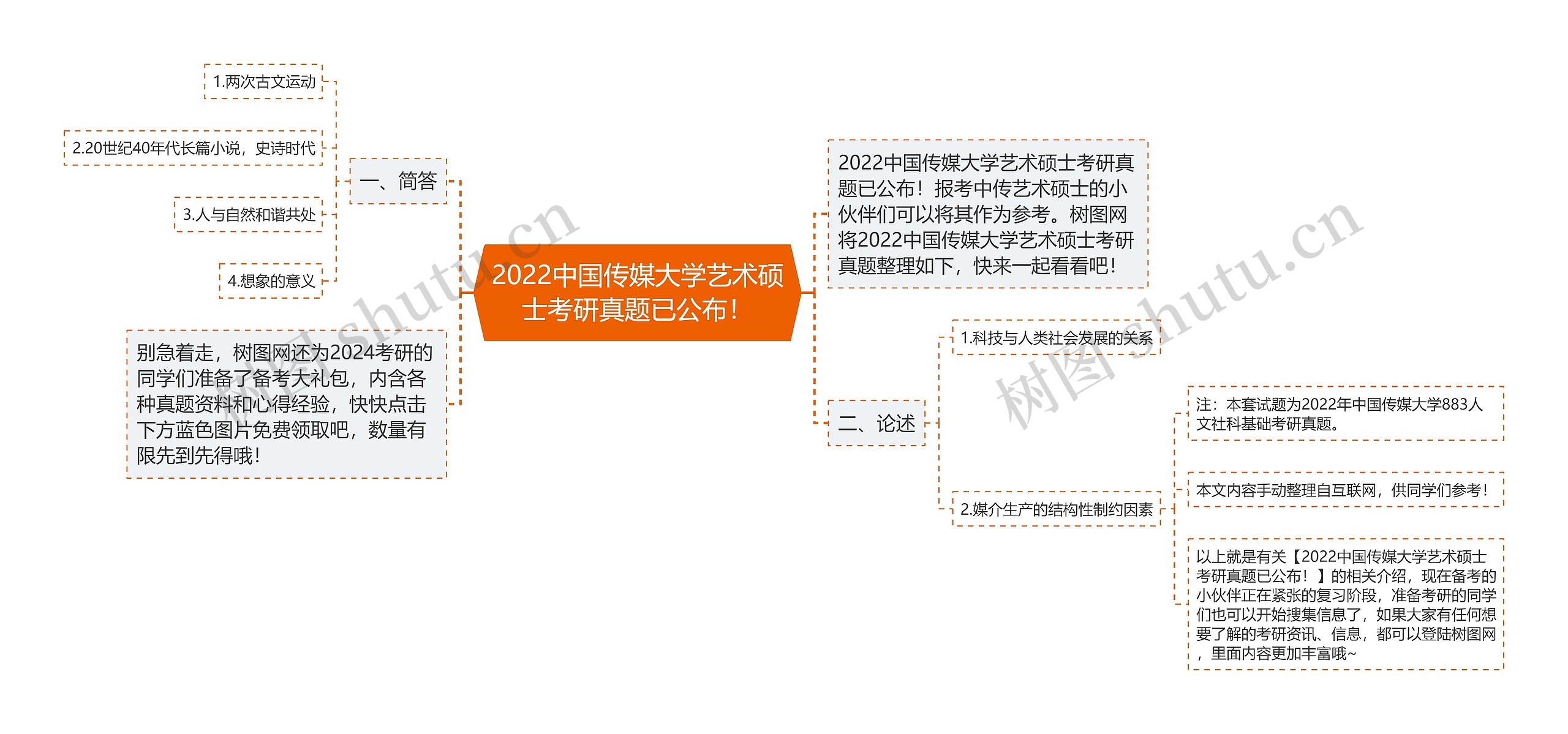树图思维导图提供《2022中国传媒大学艺术硕士考研真题已公布!》在线思维导图免费制作,点击“编辑”按钮,可对《2022中国传媒大学艺术硕士考研真题已公布!》进行在线思维导图编辑,本思维导图属于思维导图模板主题,文件编号是:4b7ebbbf987dc31bbfb07a0113d439c3