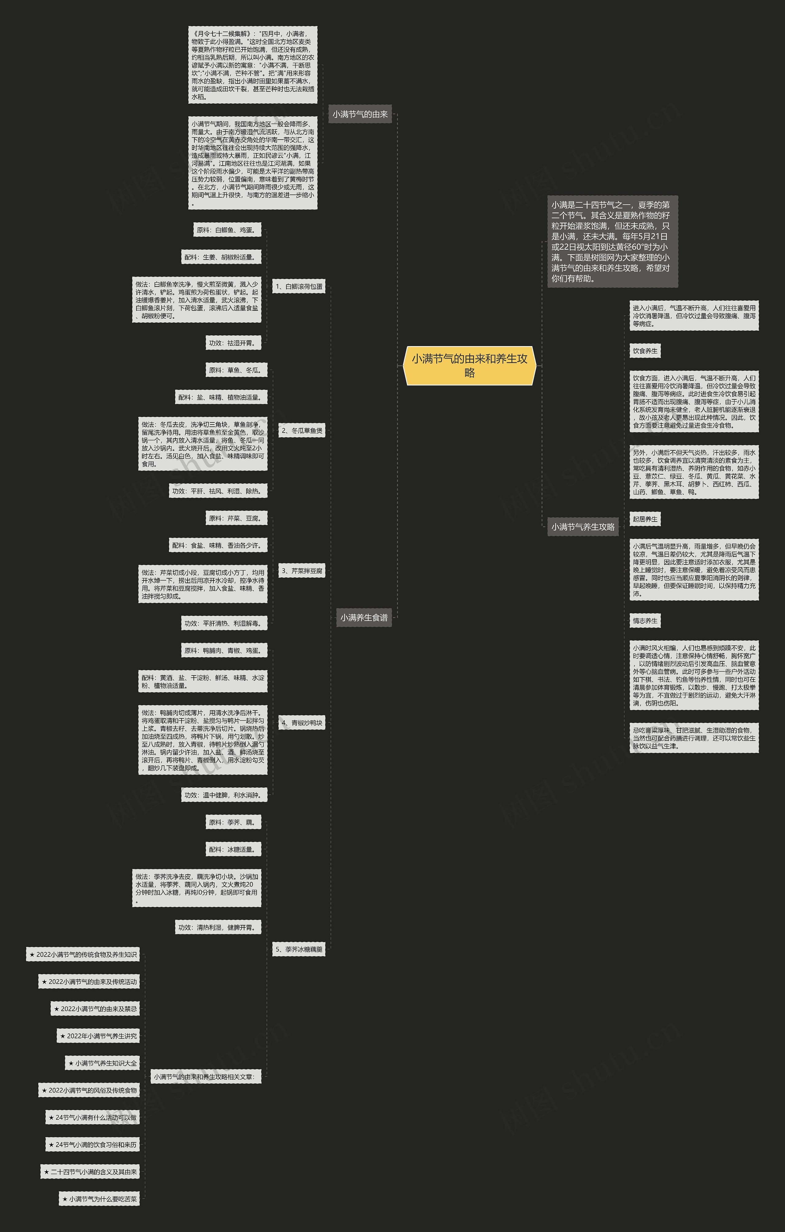 另外,小满后不但天气炎热,汗出较多,雨水也较多,饮食调养宜以清爽清淡的素食为主,常吃具有清利湿热、养阴作用的食物,如赤小豆、薏苡仁、绿豆、冬瓜、黄瓜、黄花菜、水芹、荸荠、黑木耳、胡萝卜、西红柿、西瓜、山药、鲫鱼、草鱼、鸭。