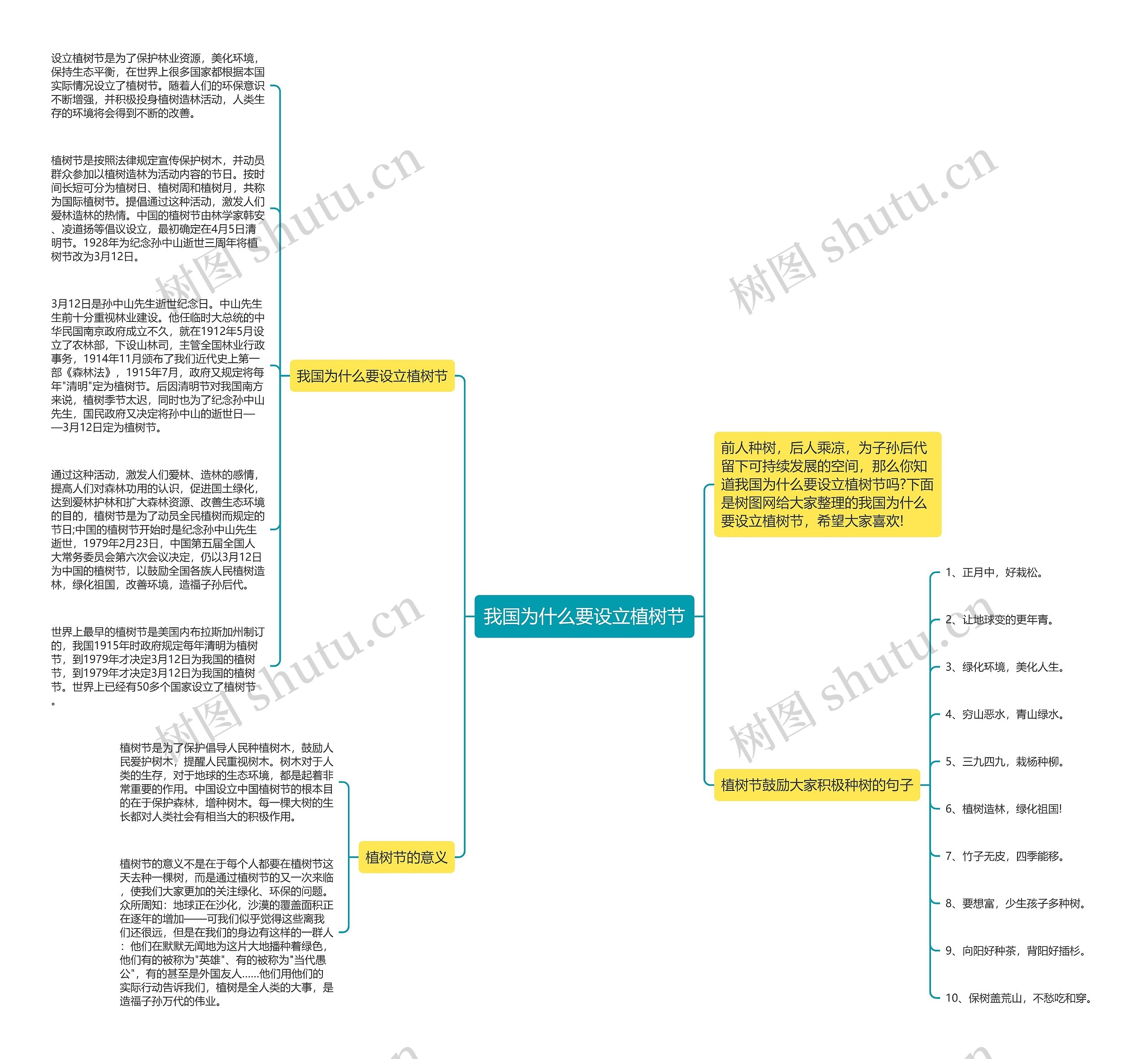 世界上最早的植树节是美国内布拉斯加州制订的,我国1915年时政府规定每年清明为植树节,到1979年才决定3月12日为我国的植树节,到1979年才决定3月12日为我国的植树节。世界上已经有50多个国家设立了植树节。