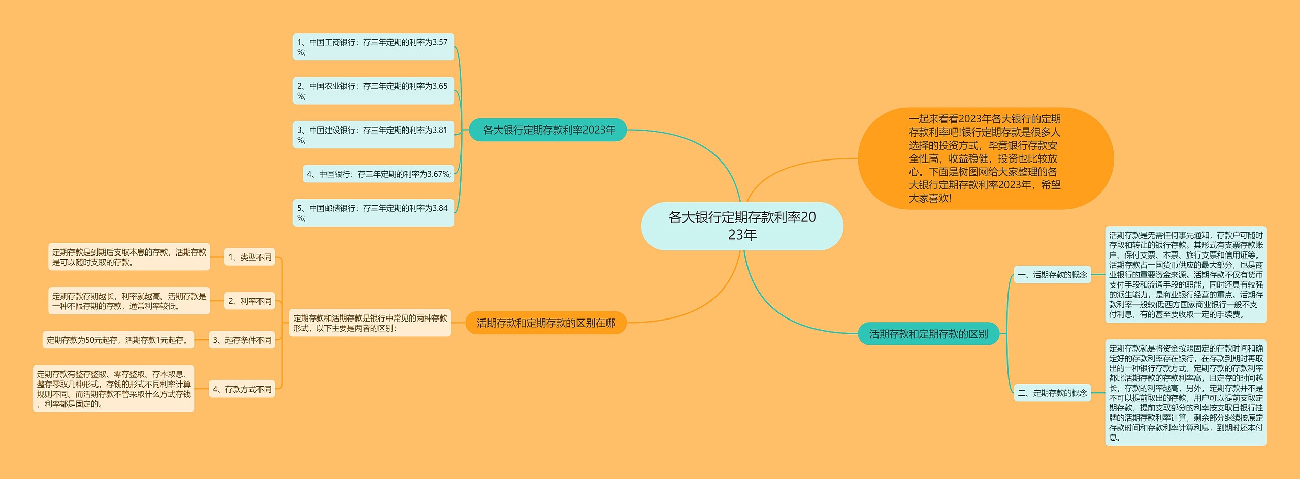 树图思维导图提供《各大银行定期存款利率2023年》在线思维导图免费制作,点击“编辑”按钮,可对《各大银行定期存款利率2023年》进行在线思维导图编辑,本思维导图属于思维导图模板主题,文件编号是:bec0e6d943bad755a358ad00f1344086