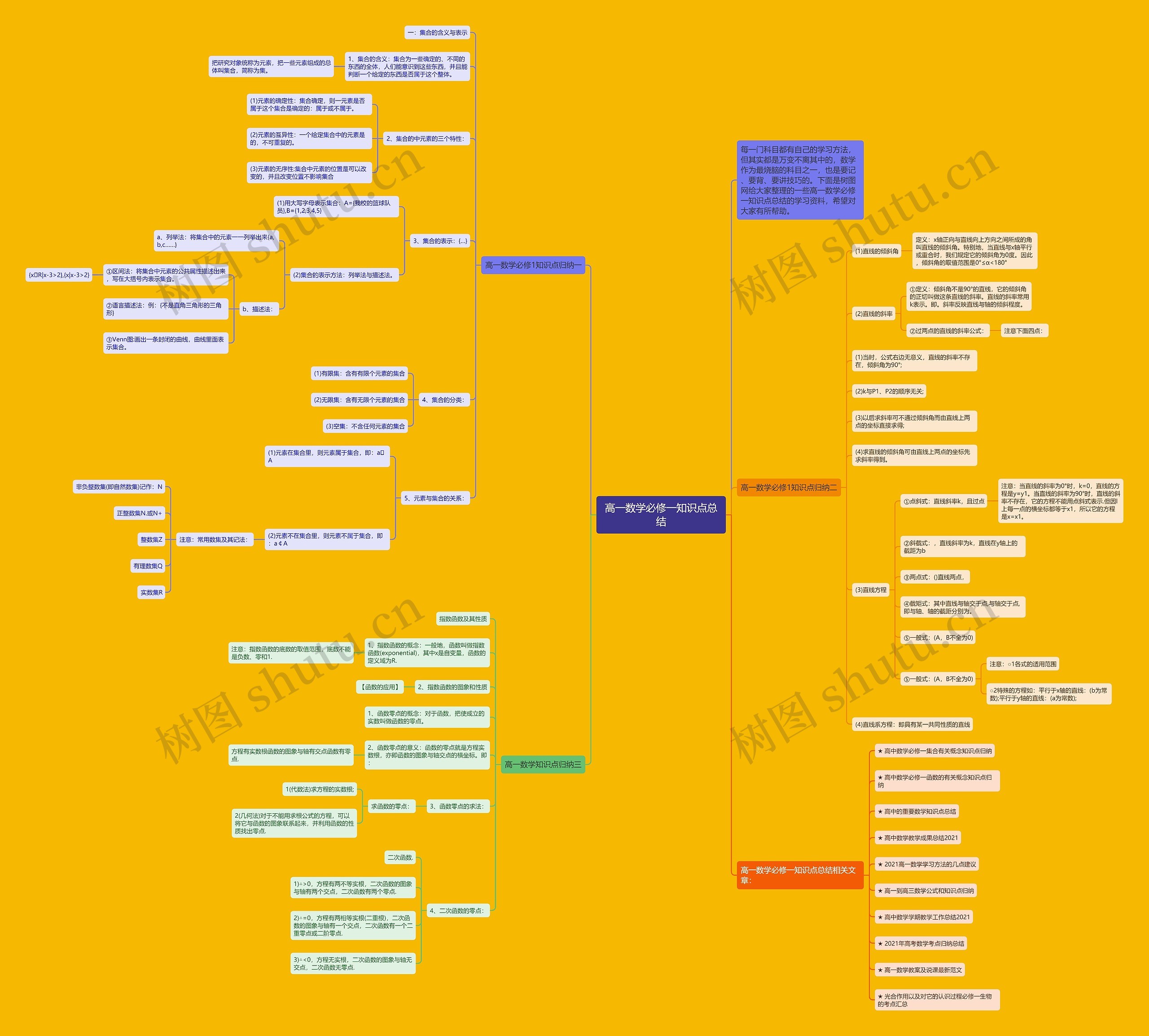 高一数学必修一知识点总结思维导图的,的知识点包含集合的含义与表示,直线的倾斜角和斜率计算,集合的定义包含元素的确定性、互异性和无序性,表示方法有列举法和描述法,而分类包含有限集、无限集和空集。直线倾斜角定义为x轴正向与直线向上方向所成的角度,规定倾斜角取值为0°≤α<180°,斜率是直线上两点之间的垂直距离和水平距离之比,可以求斜率的公式是k=(y2-y1)/(x2-x1),其中k表示斜率。