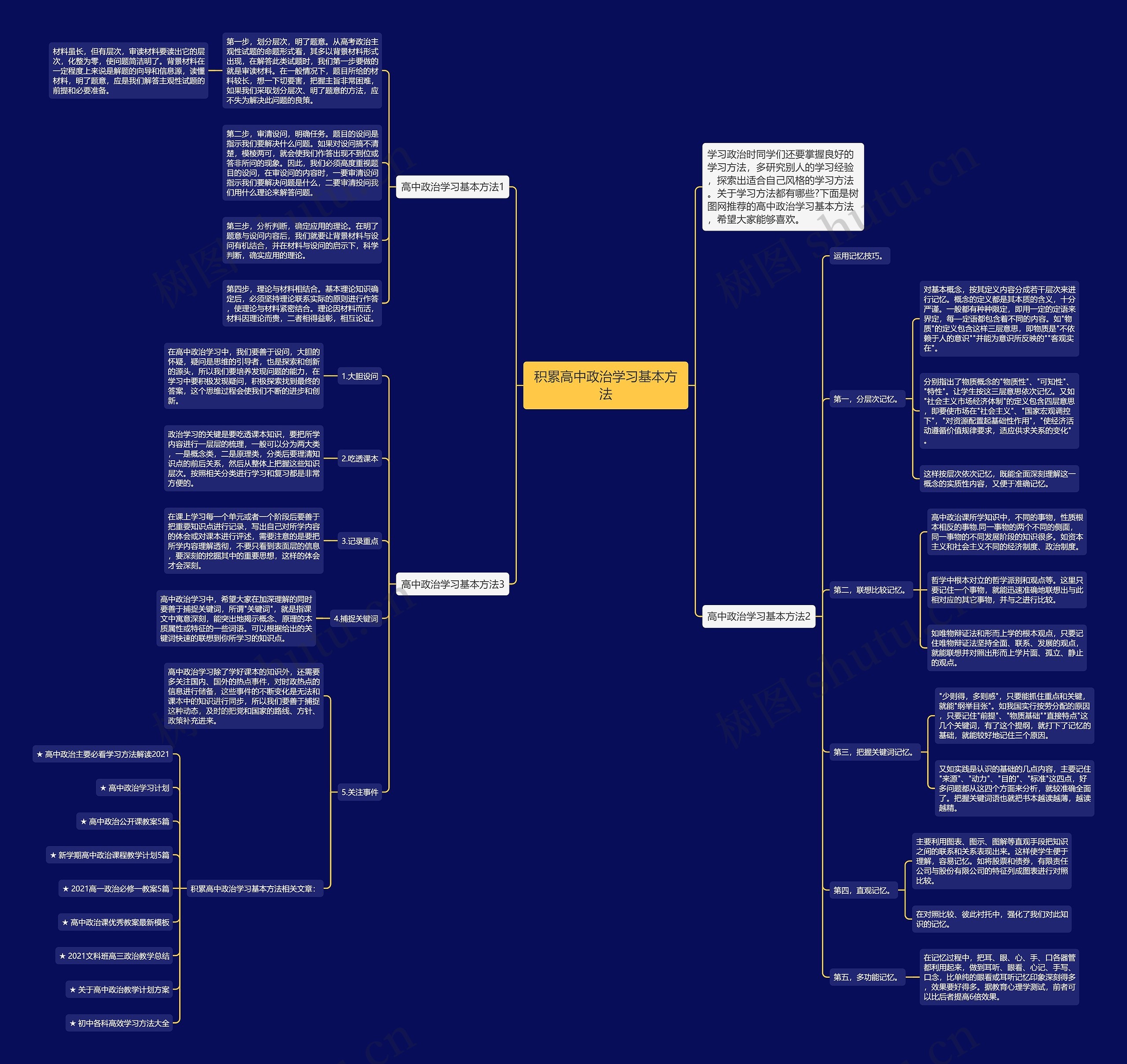 树图思维导图提供《积累高中政治学习基本方法》在线思维导图免费制作,点击“编辑”按钮,可对《积累高中政治学习基本方法》进行在线思维导图编辑,本思维导图属于思维导图模板主题,文件编号是:04c38ca48c3f9759246d9652961af1dd