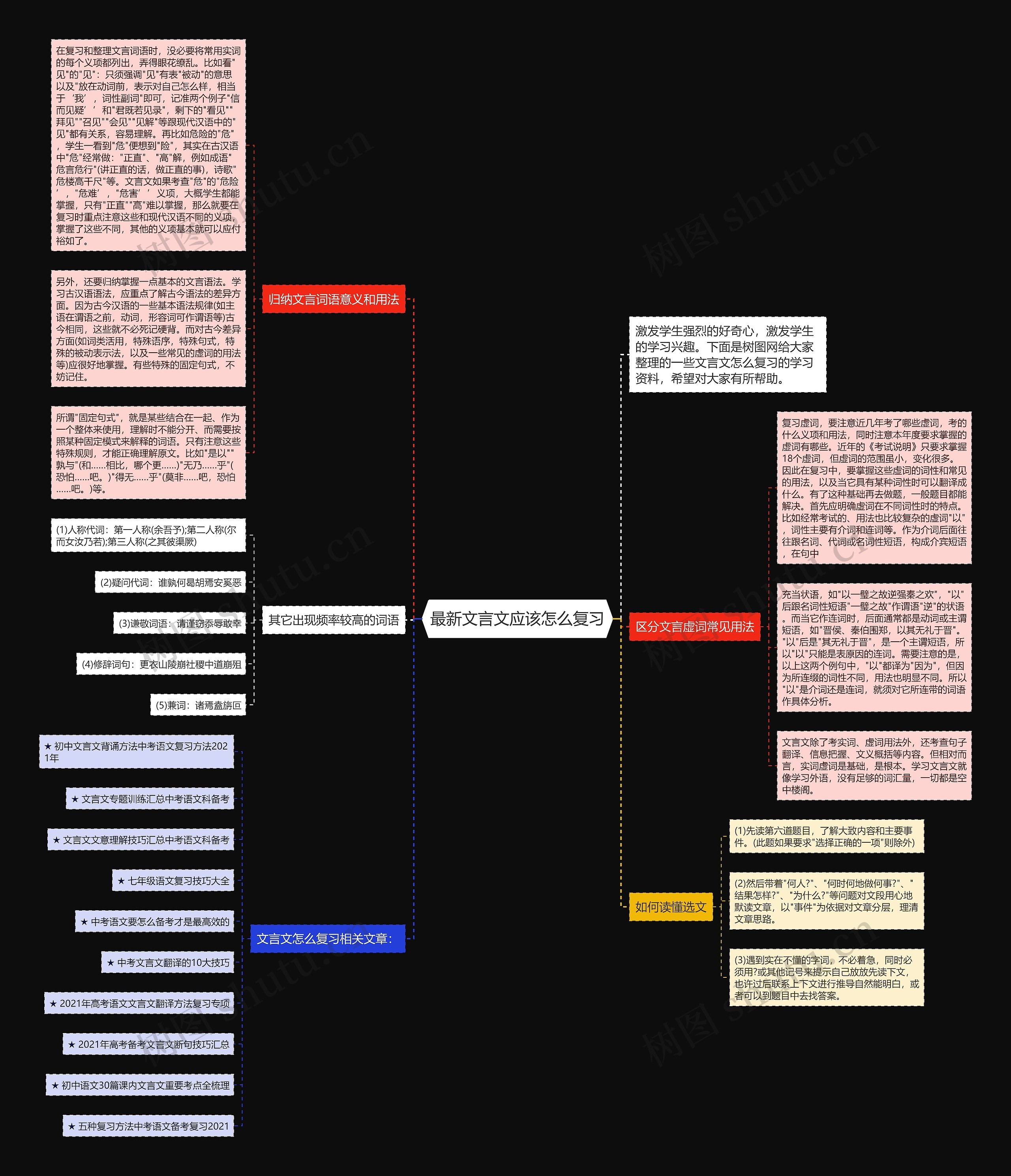 另外,还要归纳掌握一点基本的文言语法。学习古汉语语法,应重点了解古今语法的差异方面。因为古今汉语的一些基本语法规律(如主语在谓语之前,动词,形容词可作谓语等)古今相同,这些就不必死记硬背。而对古今差异方面(如词类活用,特殊语序,特殊句式,特殊的被动表示法,以及一些常见的虚词的用法等)应很好地掌握。有些特殊的固定句式,不妨记住。