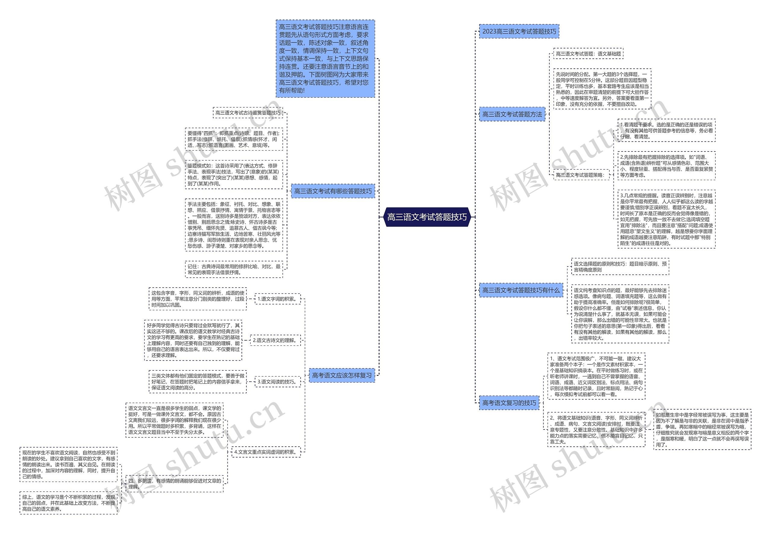 树图思维导图提供《高三语文考试答题技巧》在线思维导图免费制作,点击“编辑”按钮,可对《高三语文考试答题技巧》进行在线思维导图编辑,本思维导图属于思维导图模板主题,文件编号是:b8f70175b5f98a9ab25ca1089a42504a