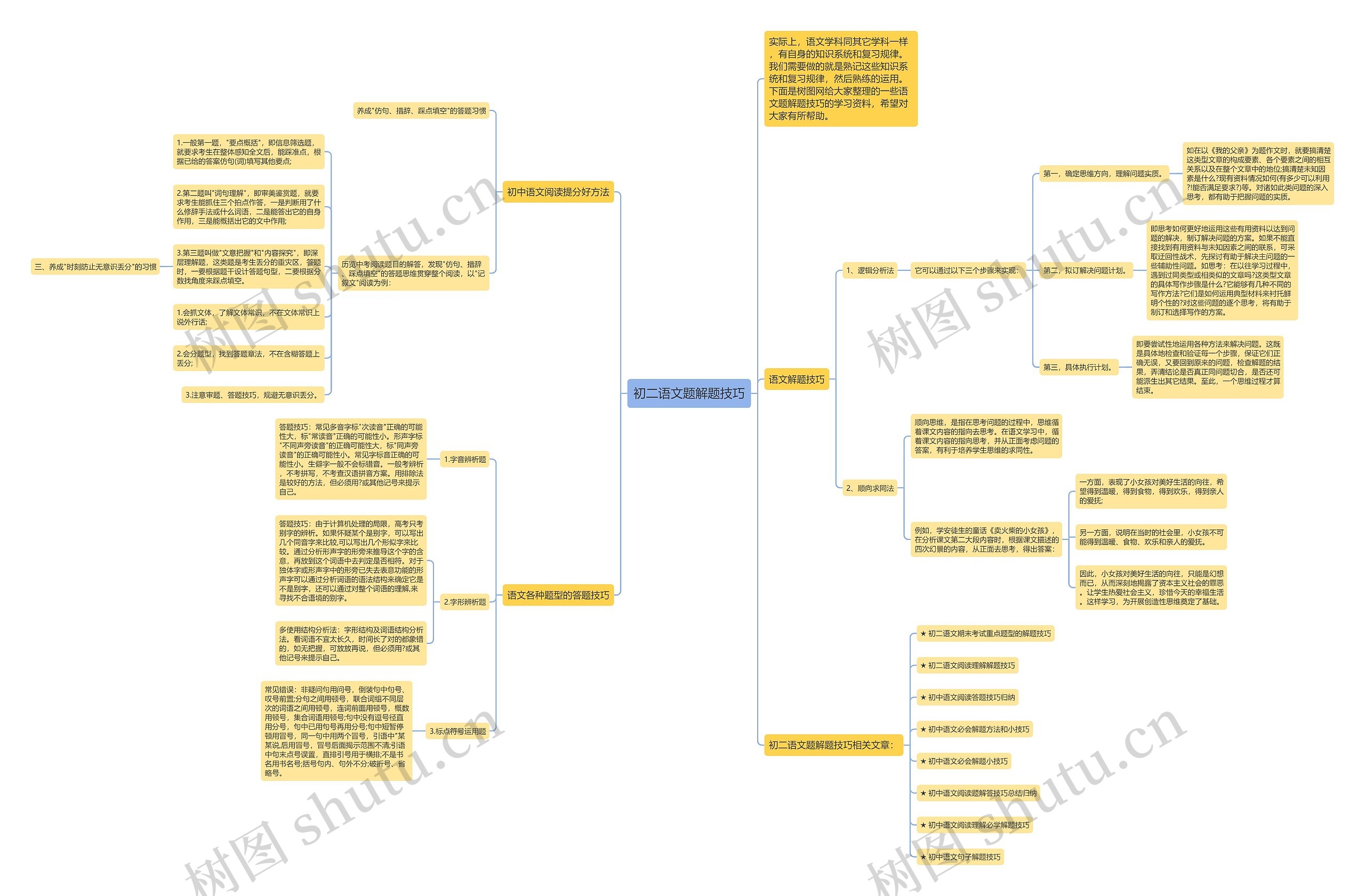 树图思维导图提供《初二语文题解题技巧》在线思维导图免费制作,点击“编辑”按钮,可对《初二语文题解题技巧》进行在线思维导图编辑,本思维导图属于思维导图模板主题,文件编号是:9aeae370b2eab99aa3152dc3b15824b9