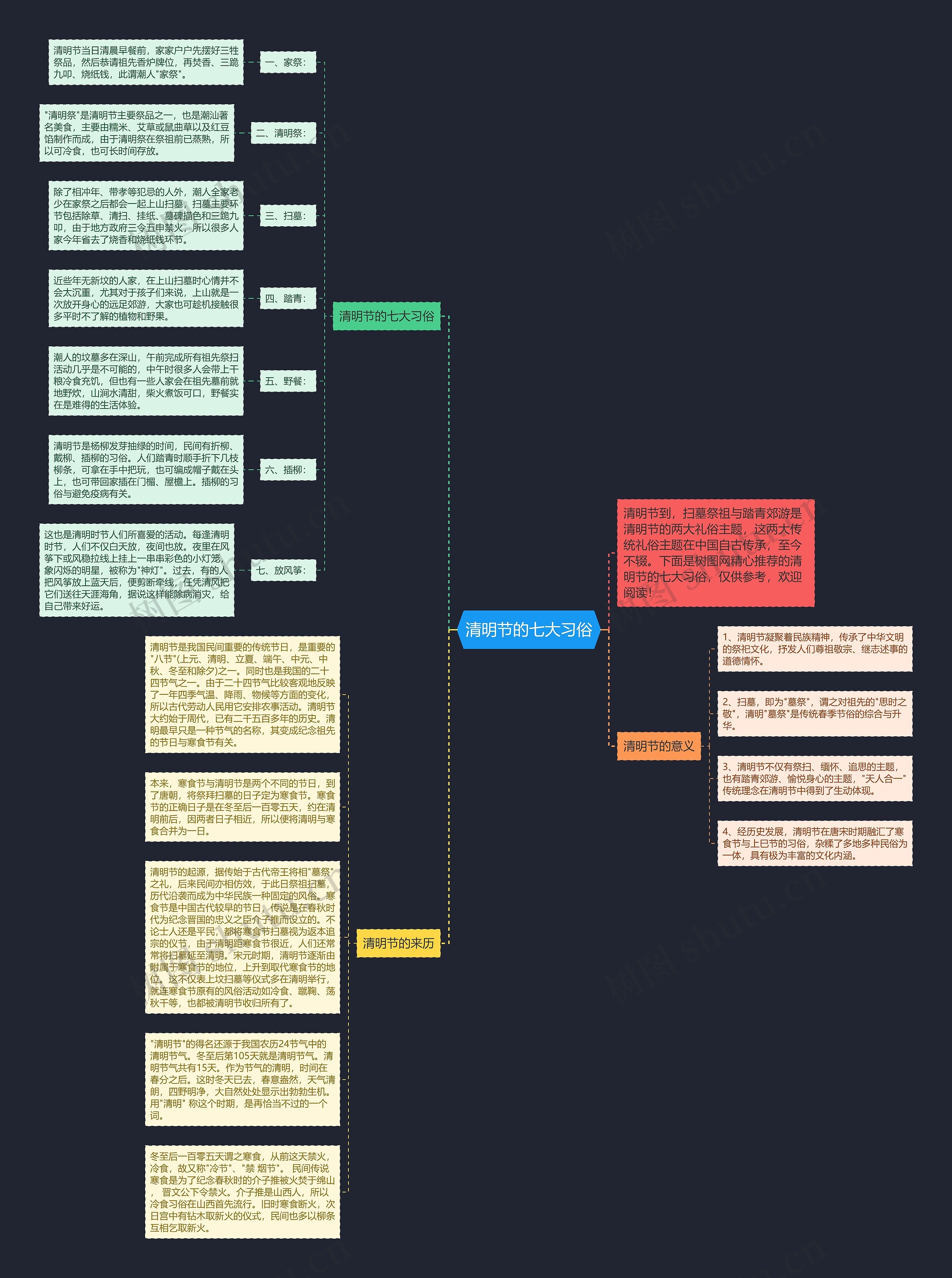 清明节的起源,据传始于古代帝王将相"墓祭"之礼,后来民间亦相仿效,于此日祭祖扫墓,历代沿袭而成为中华民族一种固定的风俗。寒食节是中国古代较早的节日,传说是在春秋时代为纪念晋国的忠义之臣介子推而设立的。不论士人还是平民,都将寒食节扫墓视为返本追宗的仪节,由于清明距寒食节很近,人们还常常将扫墓延至清明。宋元时期,清明节逐渐由附属于寒食节的地位,上升到取代寒食节的地位。这不仅表上坟扫墓等仪式多在清明举行,就连寒食节原有的风俗活动如冷食、蹴鞠、荡秋千等,也都被清明节收归所有了。