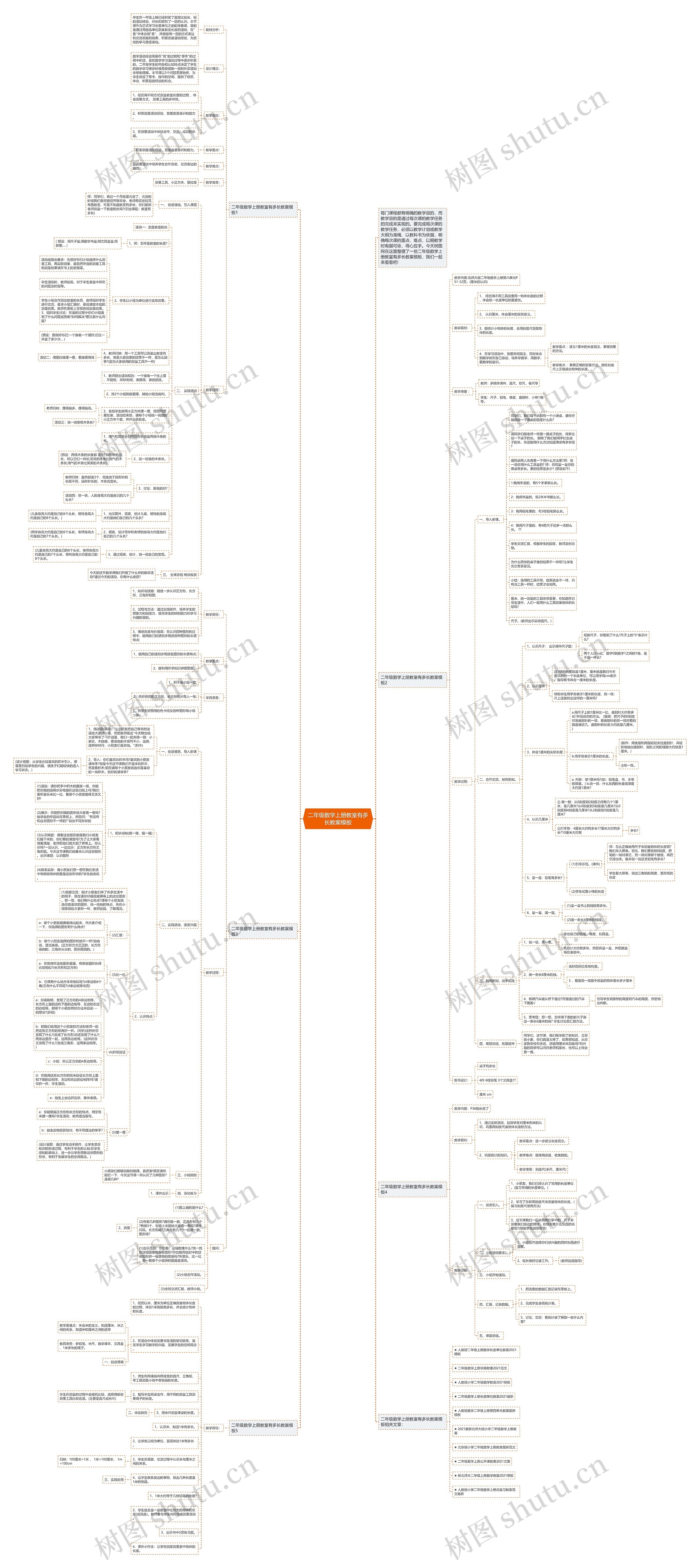 模板展示了二年级数学上册教室有多长教案思维导图的知识点,针对教学目标,教师需要以教学计划或教学大纲为准绳、以教科书为依据,明确每次课的重点、难点,教学活动需要创设情境,引入课题,并注重学生的操作和思考,提供直接经验的机会。针对本次,教学的重点在于积累测量活动经验,发展度量意识和能力,教学的难点在于培养学生合作互助、交流表达的能力,教师需要做好教学准备,包含测量工具、小正方体、易拉罐,教学具体过程包含创设情境引入课题、实践活动。