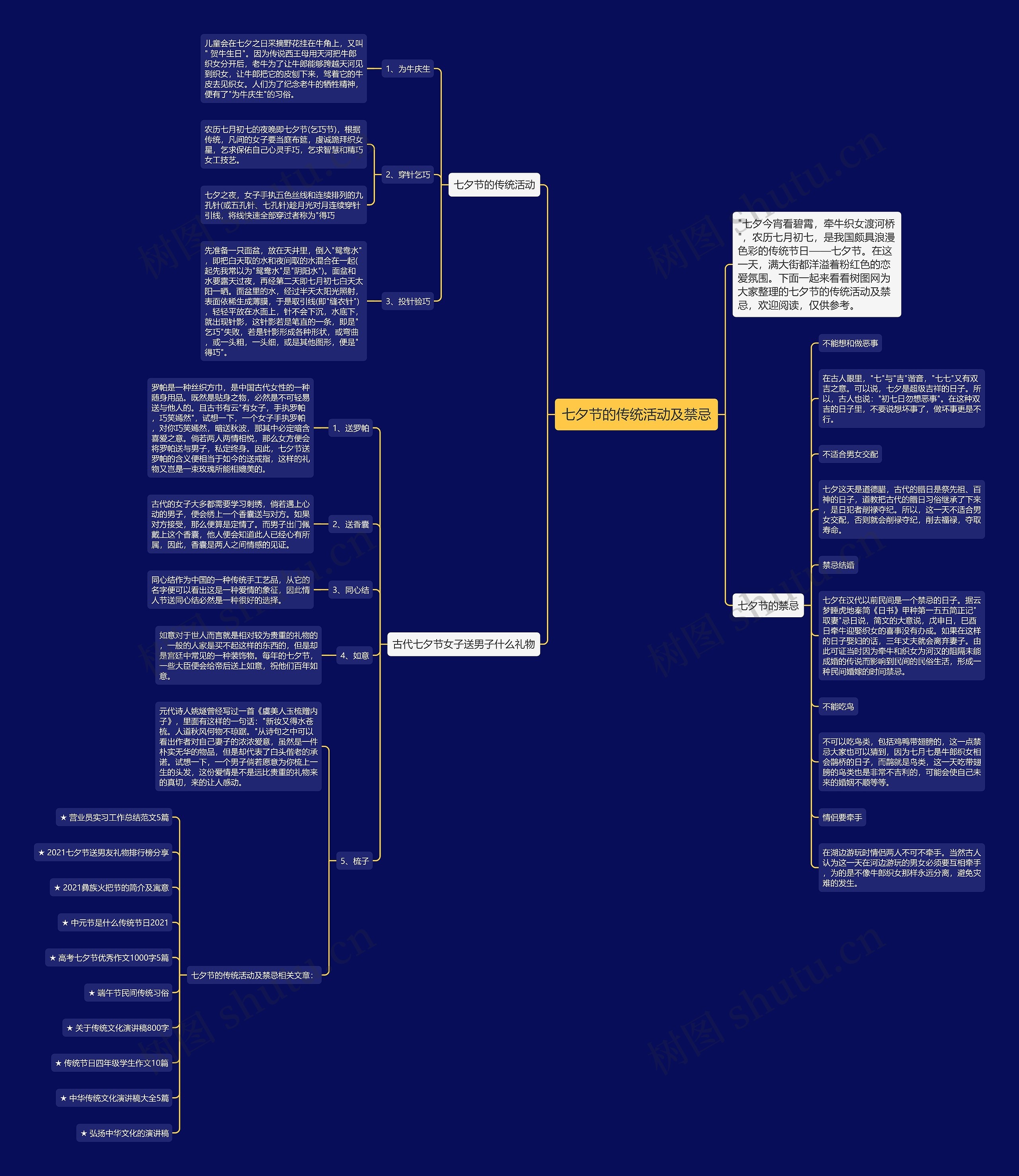 树图思维导图提供《七夕节的传统活动及禁忌》在线思维导图免费制作,点击“编辑”按钮,可对《七夕节的传统活动及禁忌》进行在线思维导图编辑,本思维导图属于思维导图模板主题,文件编号是:620b9040f56eeac350f444a78fa90702
