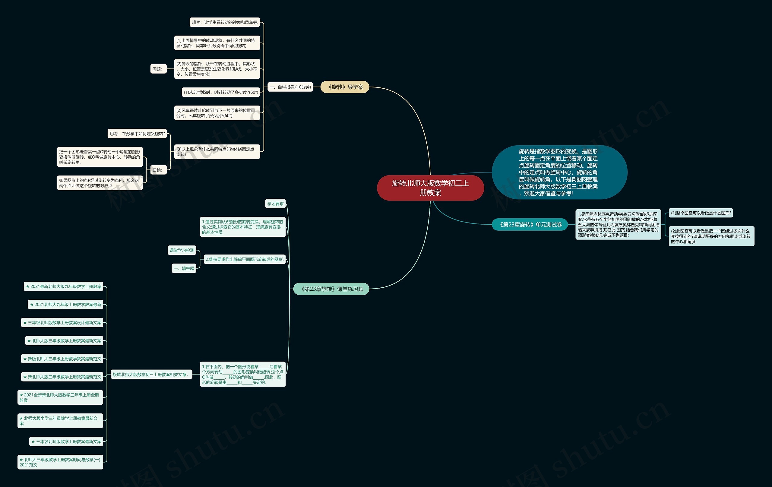 本模板介绍了旋转这个数学图形变换的概念和相关知识点,旋转中心和旋转角是旋转变换的基本要素,图形上的点经过旋转变换后对应的点叫做对应点。模板概括一些例题和练习题,帮助读者加深对旋转的理解和应用,本模板是旋转北师大版数学初三上册教案思维导图,通过观察一些实物,引导学生理解旋转的共同特点,同时思考了旋转变换的基本特征和基本性质。
