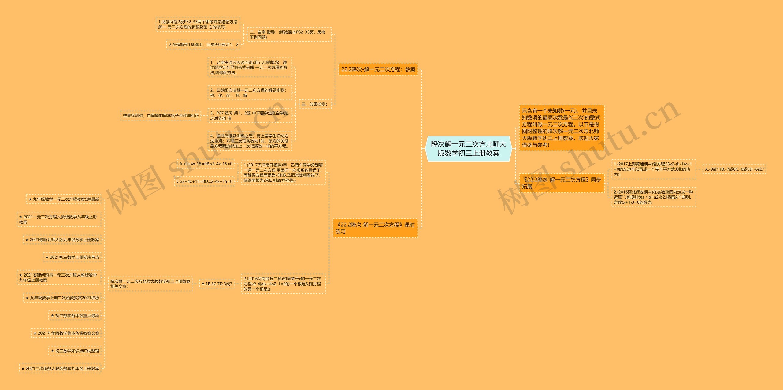 模板展示了如何降次解一元二次方程,并提供了北师大版数学初三上册教案思维导图作为参考,一元二次方程只含有一个未知数,未知数项的最高次数是2,需要通过配方法来解决,在配方法解一元二次方程中,需要掌握移、化、配、开、解的技巧,当方程二次项系数为1时,关键是方程两边都加上一次项系数一半的平方程,练习题和拓展内容供读者练习巩固。