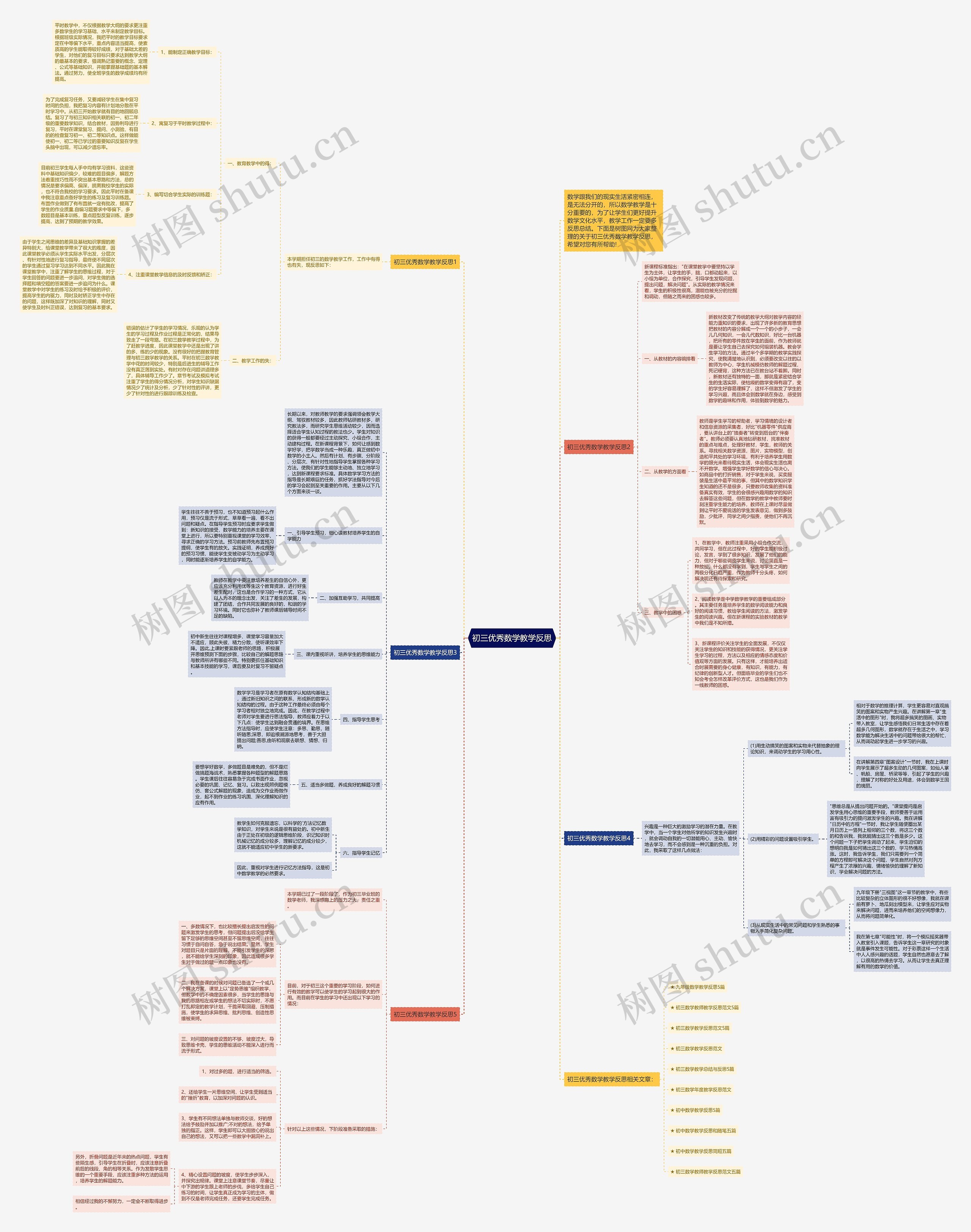初三优秀数学教学反思思维导图本模板着重总结了在教学中的得与失,能够制定正确教学目标,因学生实际情况将教学目标定在适当水平,在平时教学中寓复习于将复习内容有计划地分散学习过程中,以减少遗忘率,编写符合学生实际的训练题,重点训练基本题型,实现教学效果,课堂教学时注重信息的反馈和矫正,了解学生思维过程,及时积极评价和矫正存在问题,教学工作要多进行反思总结,以便更好的提升学生数学文化水平。