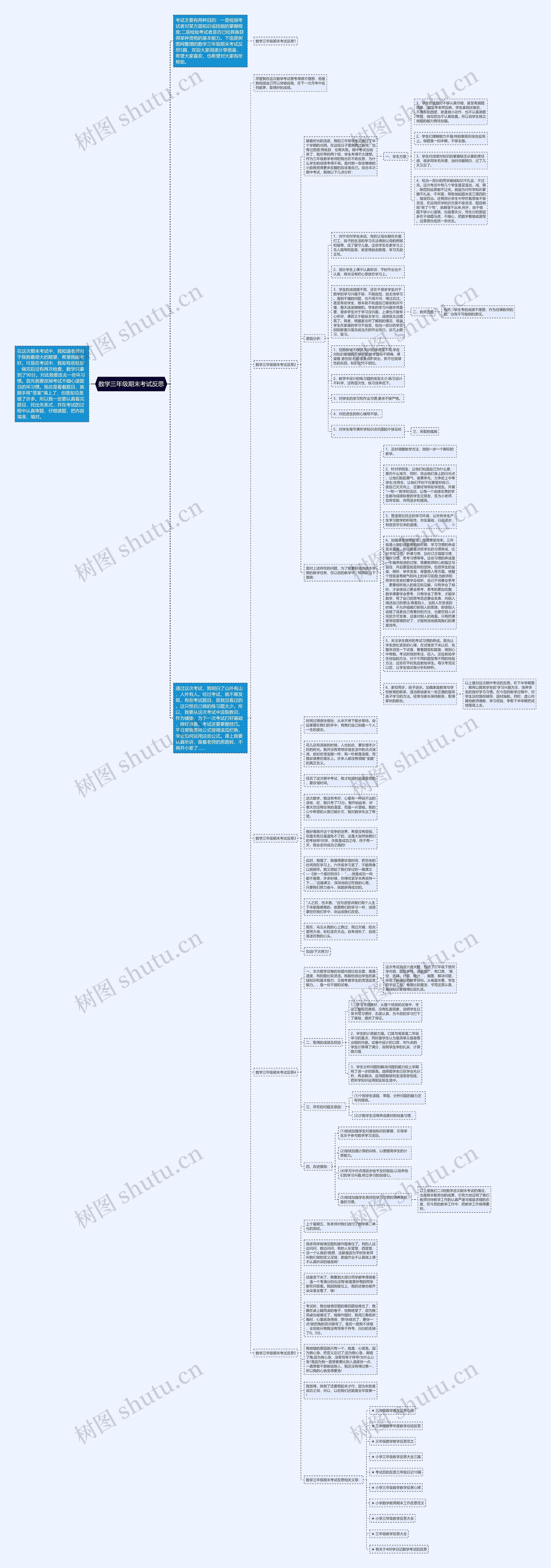 “数学三年级期末考试反思思维导图”是一篇关于学生期末数学考试的反思模板,考试有两种目的:检测考试者对知识或技能的掌握程度和是否获得某种资格的基本能力。模板概括五篇反思思维导图模板的思维导图,其中知识点有:学生应该认真做好练习题,更加仔细认真地读题、审题,并检查答案,需要掌握解题技巧和公式,聚焦于基础知识的掌握程度,做好功课和充分准备,还需提高自身思维的灵活性和应用范围,的理解能力不够,需要增强学生的独立解题能力和责任感。