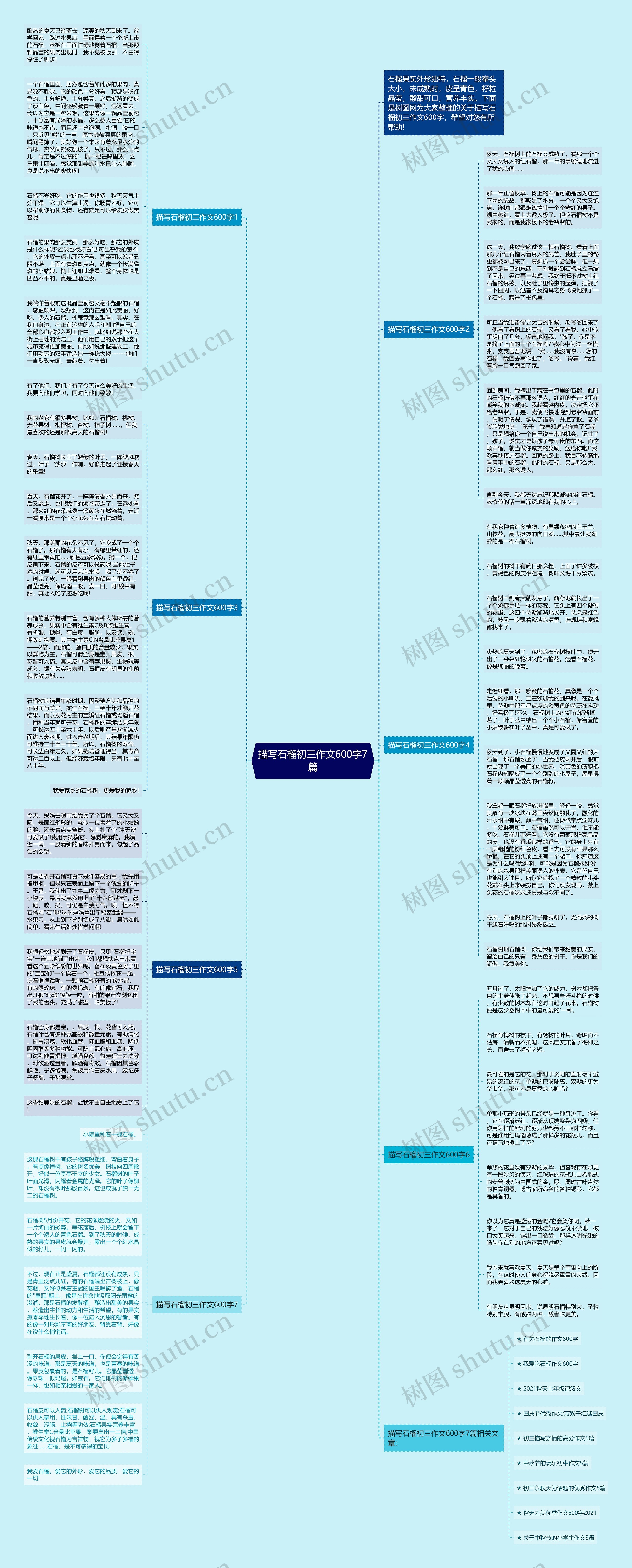 我拿起一颗石榴籽放进嘴里,轻轻一咬,感觉就象有一块冰块在嘴里突然间融化了,融化的汁水甜中有酸,酸中带甜,还微微带点涩味儿,十分鲜美可口。石榴虽然可以开胃,但不能多吃。石榴并不好看,它没有葡萄那样亮晶晶的皮,也没有香瓜那样的香气。它的身上只有一层粗糙的粉红色皮,看上去可没有苹果那么娇艳。在它的头顶上还有一个裂口,你知道这是为什么吗?我想啊,可能是因为石榴妹妹没有别的水果那样美丽诱人的外表,它希望自己也能引人注目,所以它就找了一个精致的小头花戴在头上来装扮自己。你们没发现吗,戴上头花的石榴妹妹还真是与众不同了。