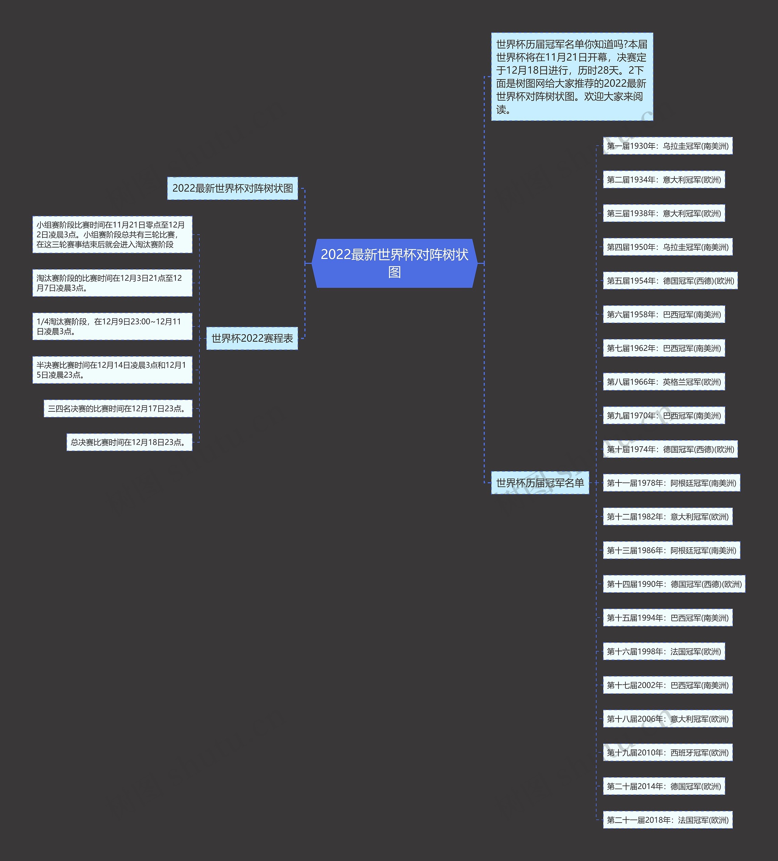 世界杯历届冠军名单你知道吗?本届世界杯将在11月21日开幕,决赛定于12月18日进行,历时28天。2下面是树图网给大家推荐的2022最新世界杯对阵树状图。欢迎大家来阅读。