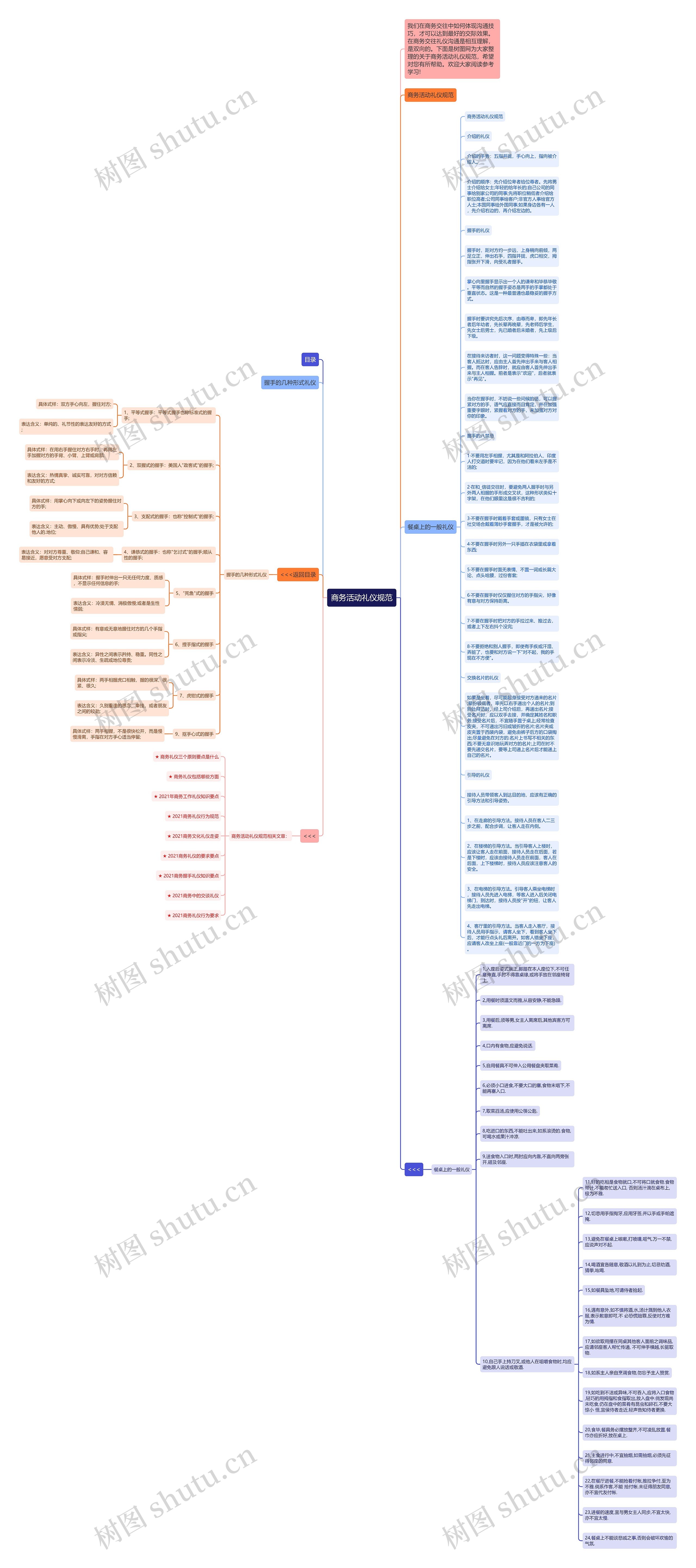 树图思维导图提供《商务活动礼仪规范》在线思维导图免费制作,点击“编辑”按钮,可对《商务活动礼仪规范》进行在线思维导图编辑,本思维导图属于思维导图模板主题,文件编号是:98ff95b46b63bfa8a5b0f6d95cdc928d