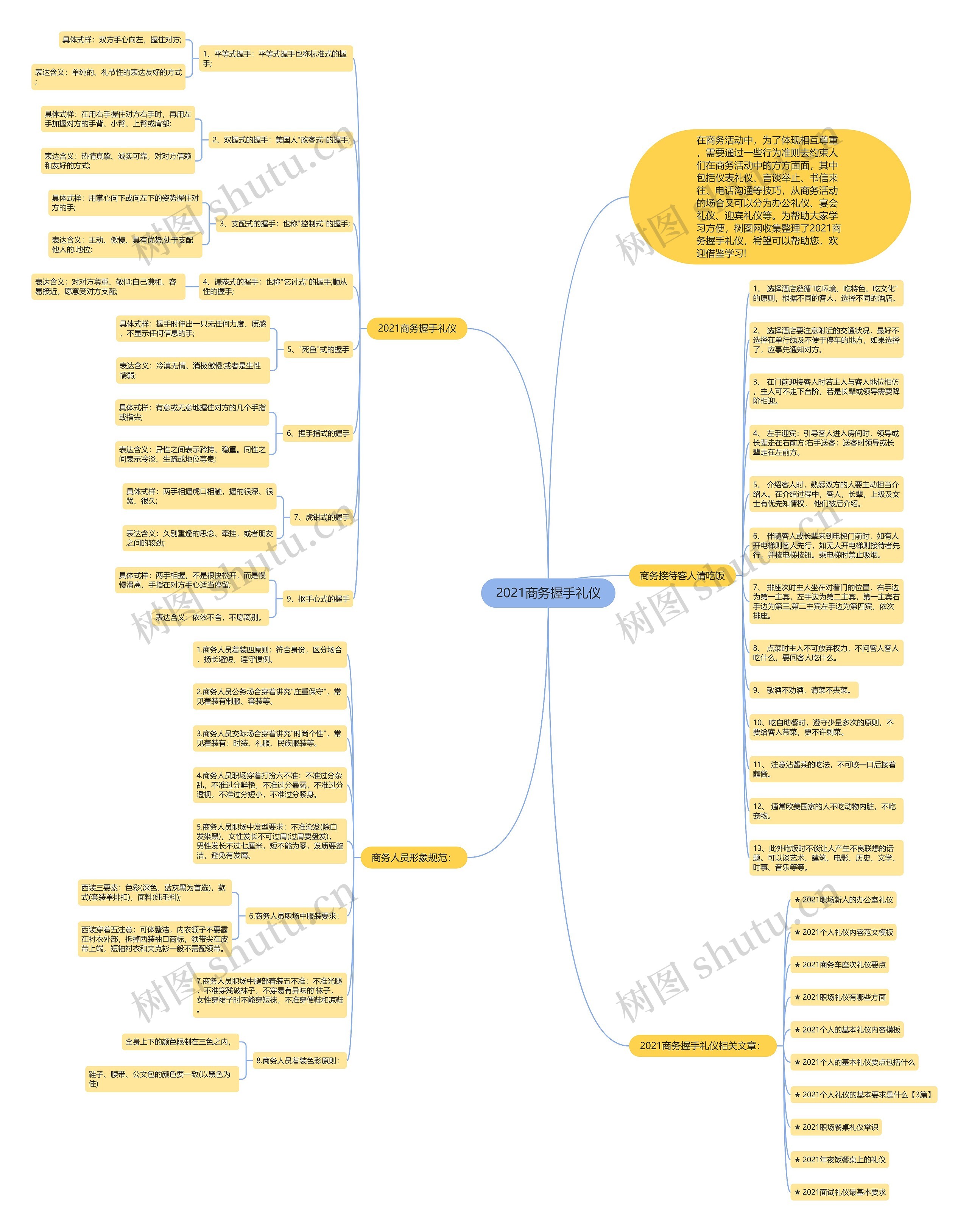 树图思维导图提供《2021商务握手礼仪》在线思维导图免费制作,点击“编辑”按钮,可对《2021商务握手礼仪》进行在线思维导图编辑,本思维导图属于思维导图模板主题,文件编号是:eeb081707b42c47e881072ca190c7852
