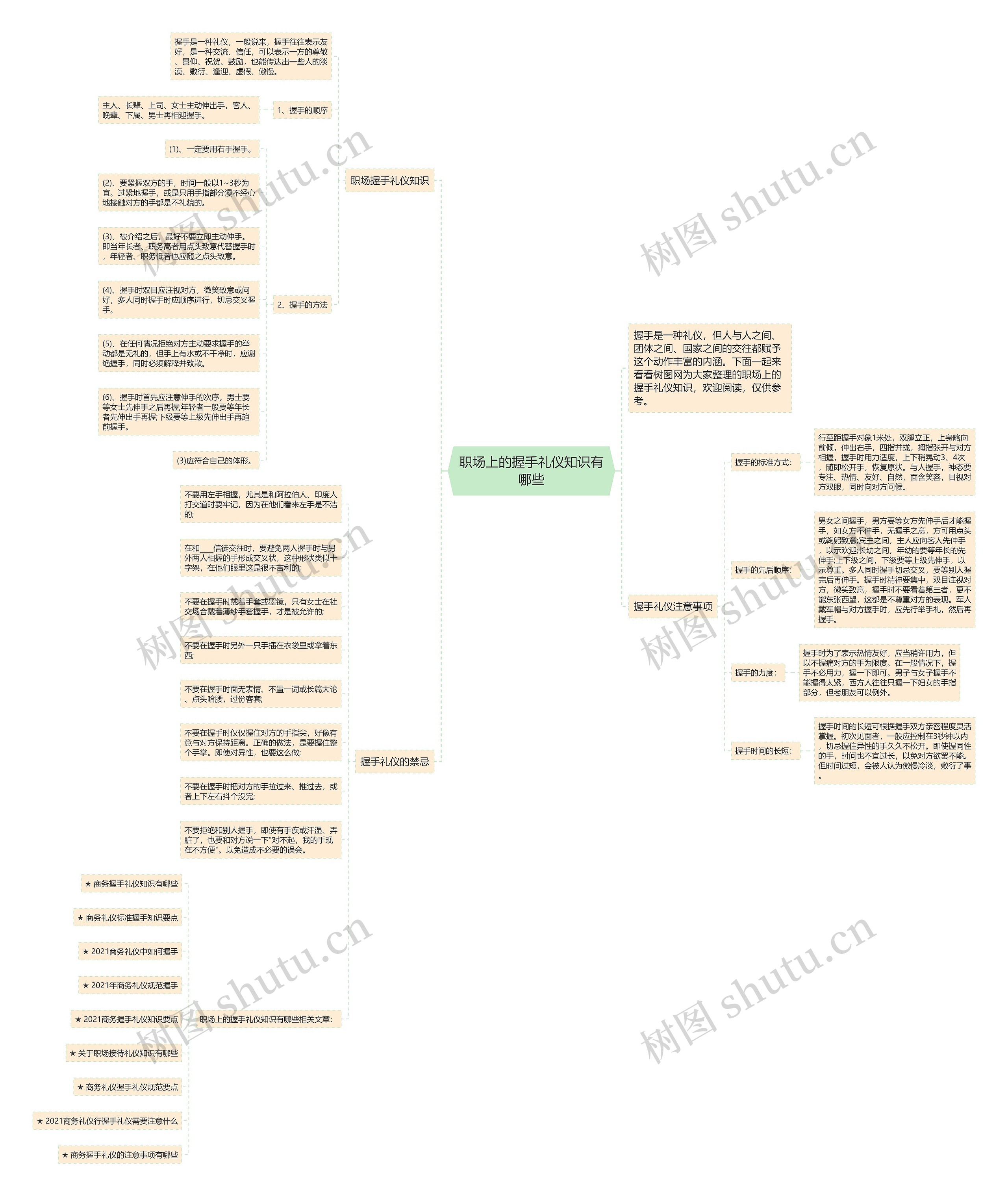 握手是一种礼仪,但人与人之间、团体之间、国家之间的交往都赋予这个动作丰富的内涵。下面一起来看看树图网为大家整理的职场上的握手礼仪知识,欢迎阅读,仅供参考。