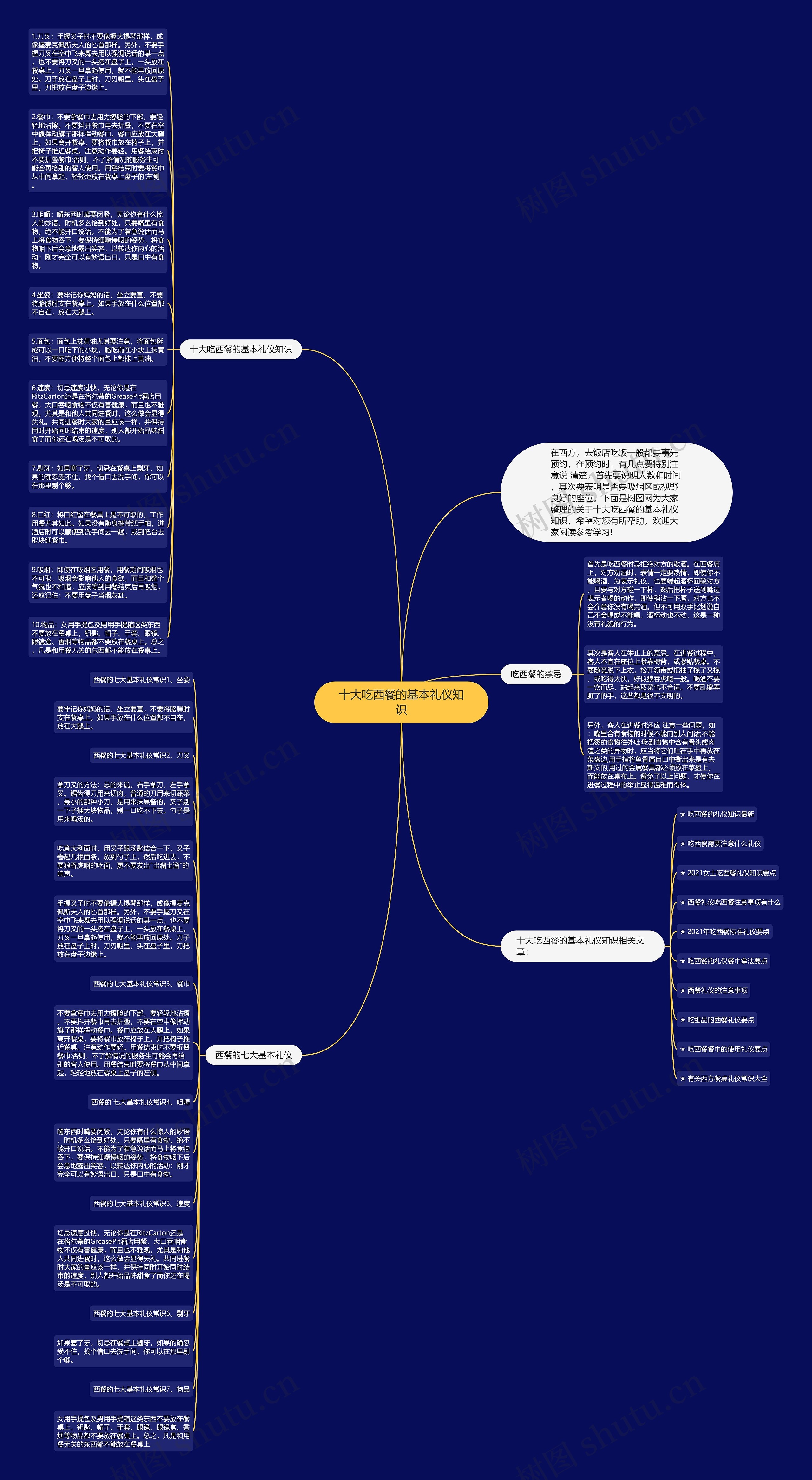 1.刀叉:手握叉子时不要像握大提琴那样,或像握麦克佩斯夫人的匕首那样。另外,不要手握刀叉在空中飞来舞去用以强调说话的某一点,也不要将刀叉的一头搭在盘子上,一头放在餐桌上。刀叉一旦拿起使用,就不能再放回原处。刀子放在盘子上时,刀刃朝里,头在盘子里,刀把放在盘子边缘上。