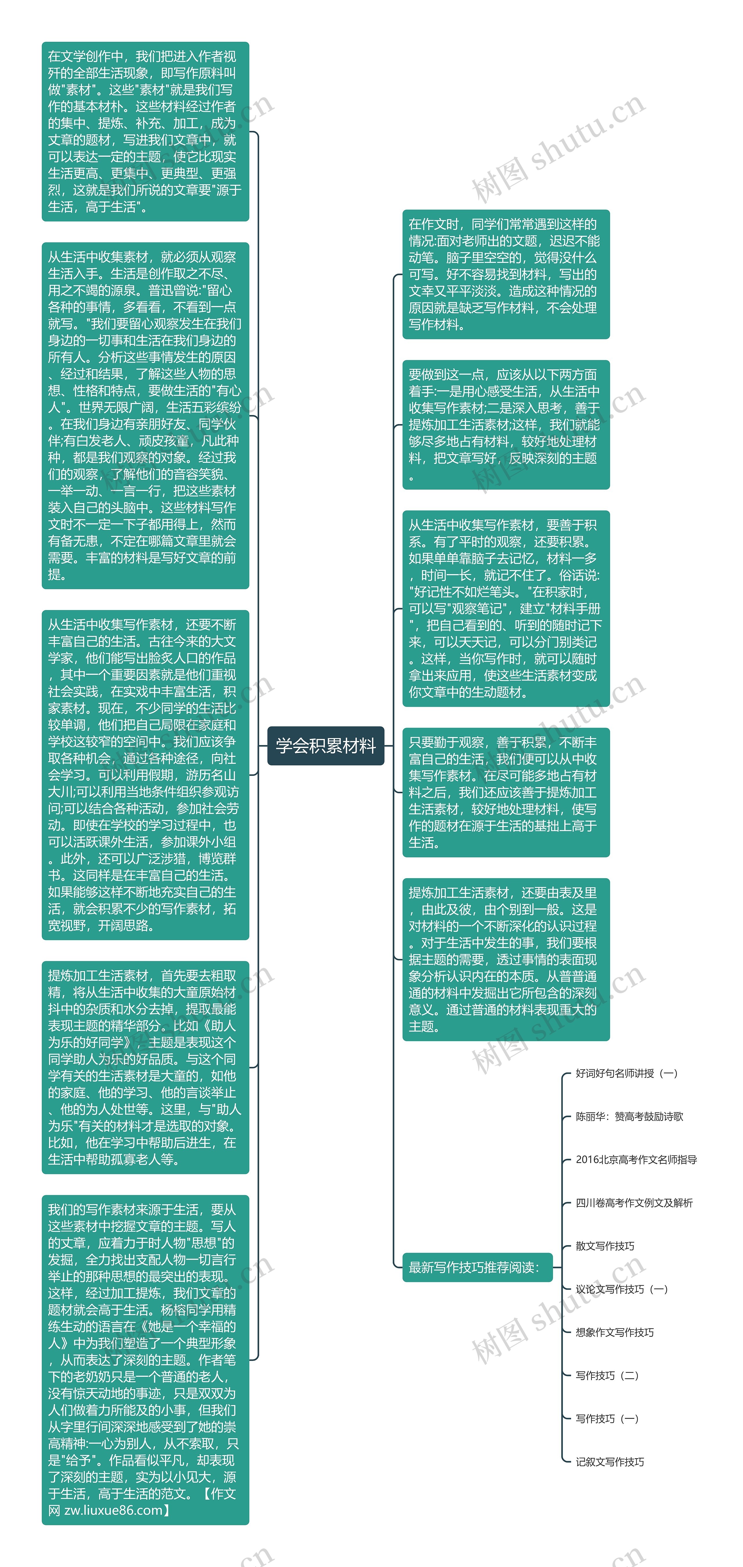 在作文时,同学们常常遇到这样的情况:面对老师出的文题,迟迟不能动笔。脑子里空空的,觉得没什么可写。好不容易找到材料,写出的文幸又平平淡淡。造成这种情况的原因就是缺乏写作材料,不会处理写作材料。