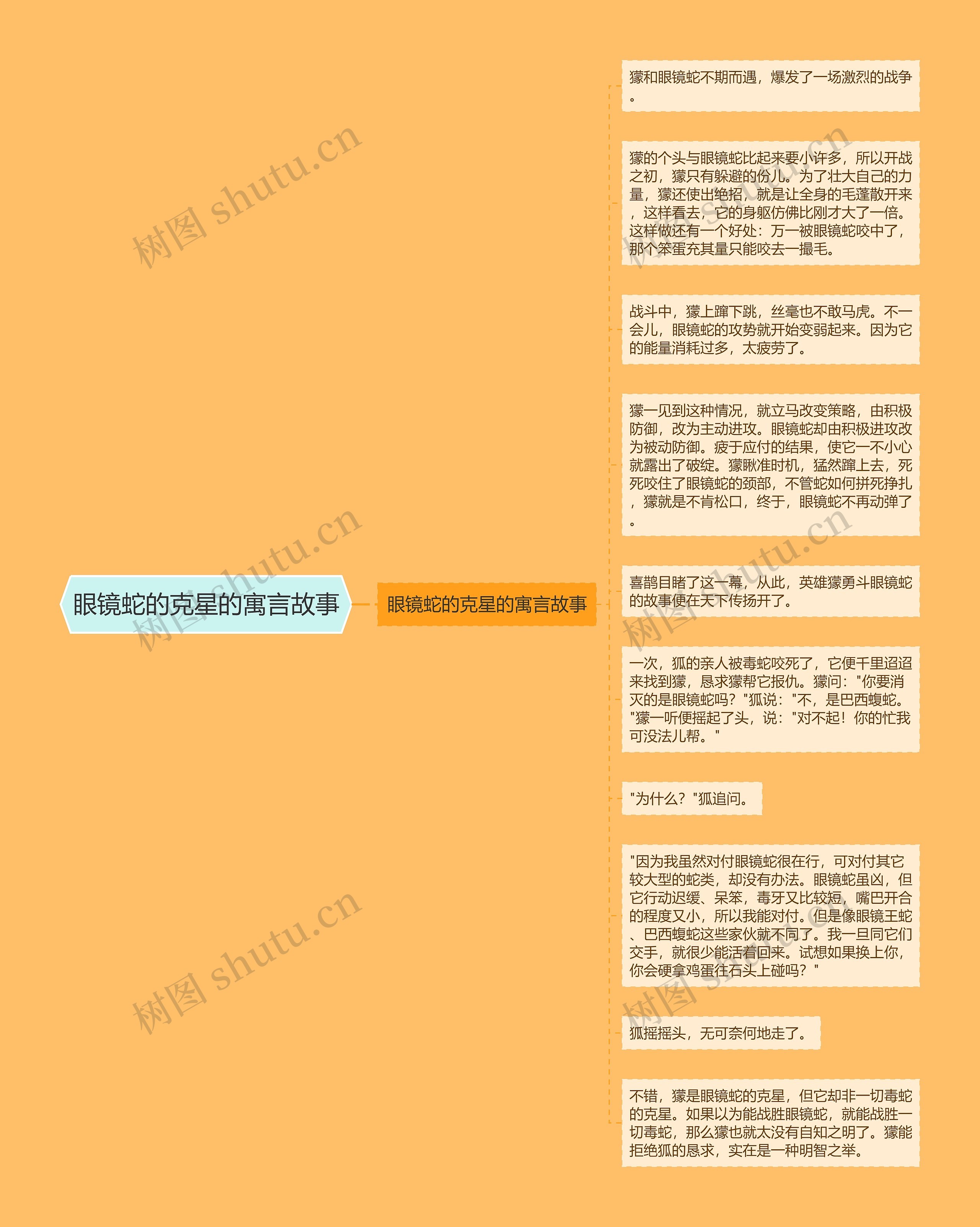 一次,狐的亲人被毒蛇咬死了,它便千里迢迢来找到獴,恳求獴帮它报仇。獴问:"你要消灭的是眼镜蛇吗?"狐说:"不,是巴西蝮蛇。"獴一听便摇起了头,说:"对不起!你的忙我可没法儿帮。"