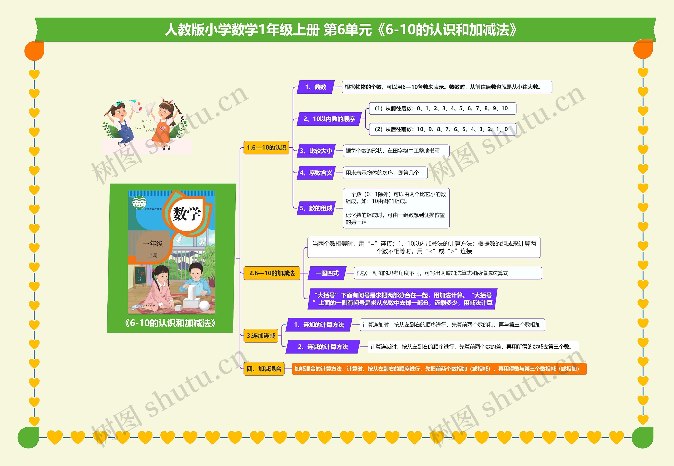 小学数学一年级上册第6单元《6-10的认识和加减法》思维导图涵盖了数的认识和加减法两个方面,在数的认识中,包含了数数、10以内数的顺序、比较大小、序数含义和数的组成。而在加减法中,介绍了10以内加减法的计算方法、连加连减和加减混合的计算方法,其中连加的计算方法按从左到右的顺序进行,先算前两个数的和,在与第三个数相加,连减时也是按从左到右的顺序进行,先算前两个数的差,再用所得的数减去第三个数。加减混合的计算方法为先把前两个数相加(或相减),再用得数与第三个数相减(或相加),这份思维导图可以帮助小学一年级的学生更好的理解和掌握6—10的认识和加减法。