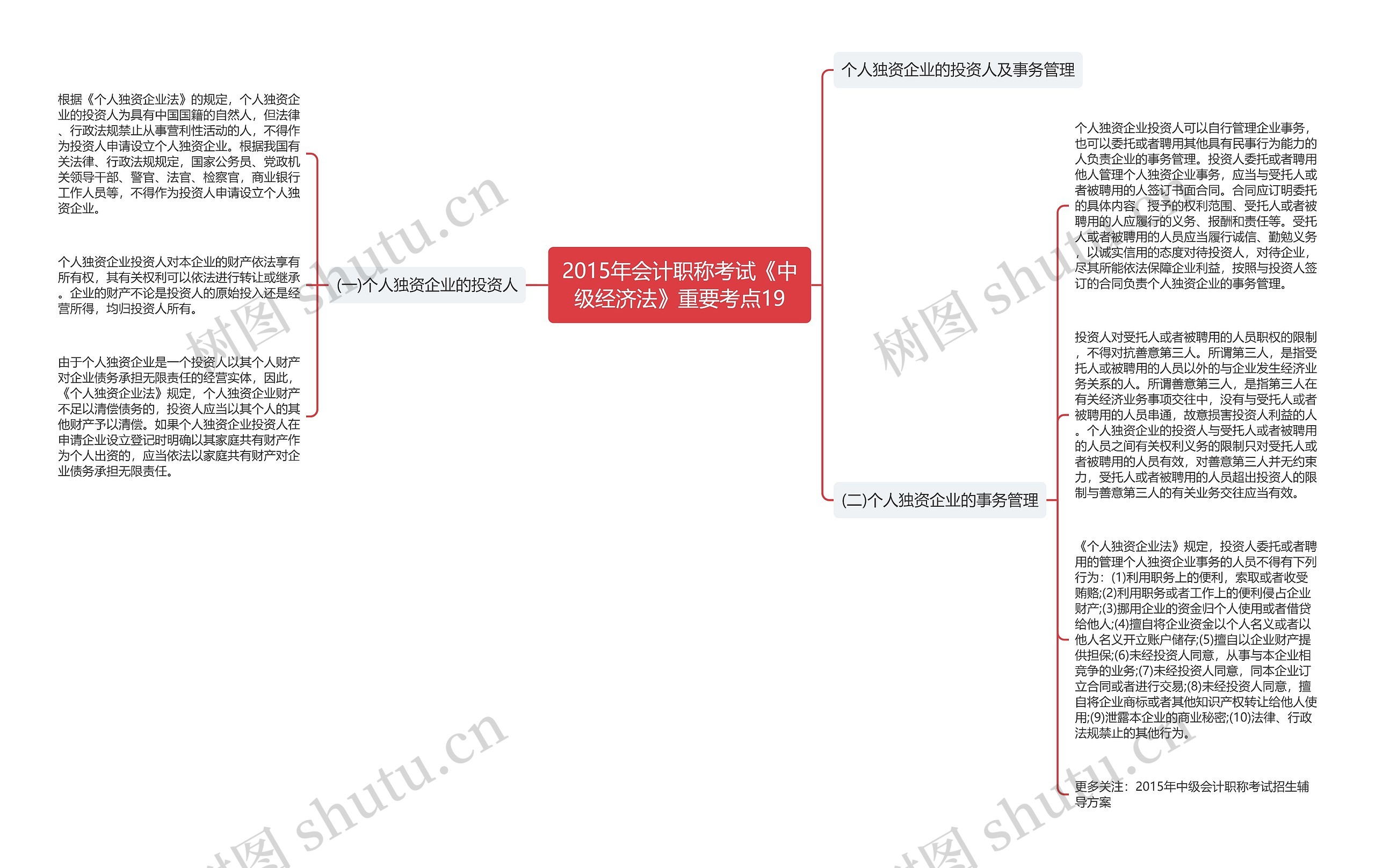 个人独资企业的投资人及事务管理(一)个人独资企业的投资人根据《个人独资企业法》的规定,个人独资企业的投资人为具有中国国籍的自然人,但法律、行政法规禁止从事营利性活动的人,不得作为投资人申请设立个人独资...《2015年会计职称考试《中级经济法》重要考点19》由树图网中级会计师考试网发布。