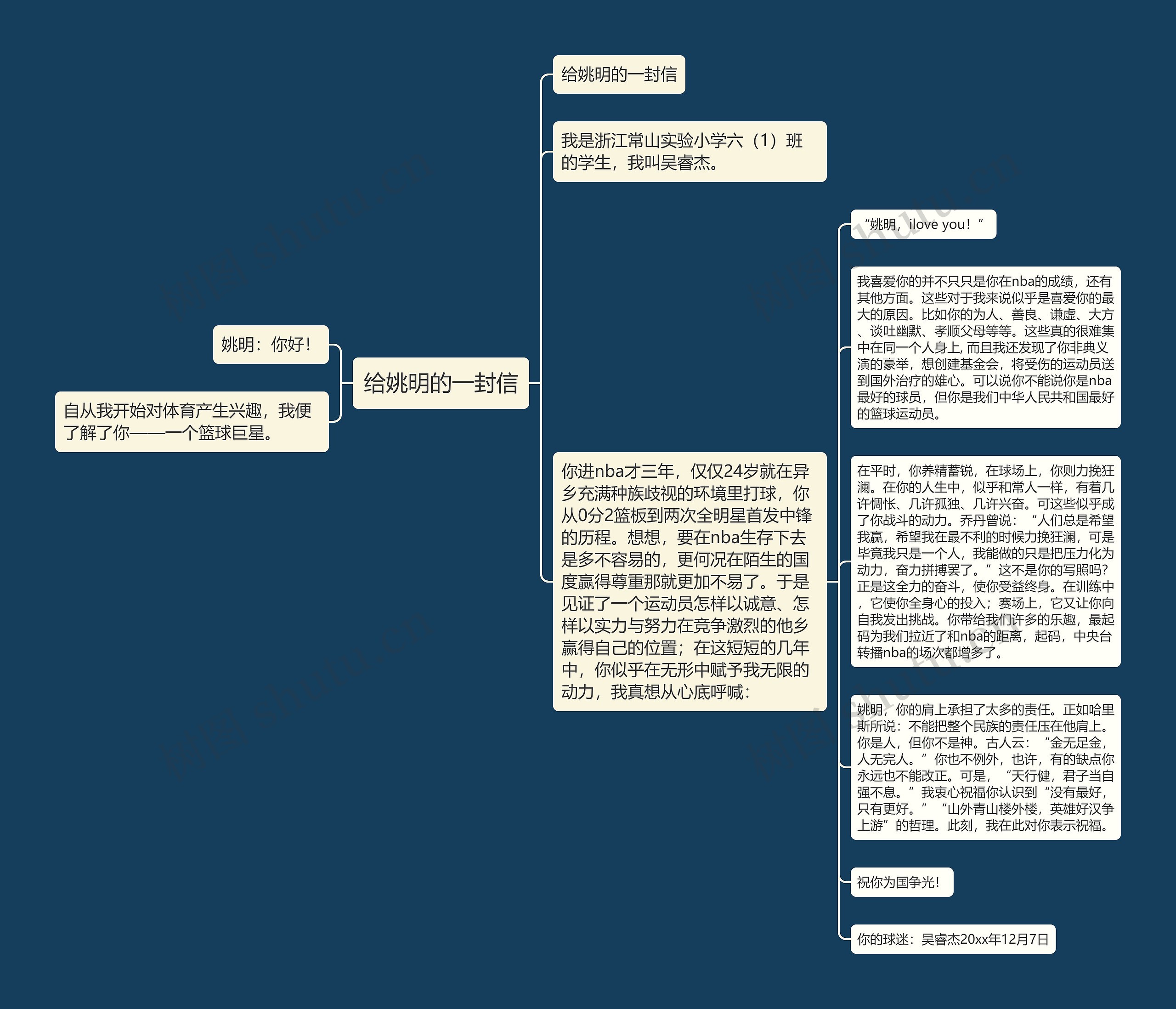 树图思维导图提供《给姚明的一封信》在线思维导图免费制作,点击“编辑”按钮,可对《给姚明的一封信》进行在线思维导图编辑,本思维导图属于思维导图模板主题,文件编号是:fbb0bf9fd4cacc87bca2fc9177fd2bea