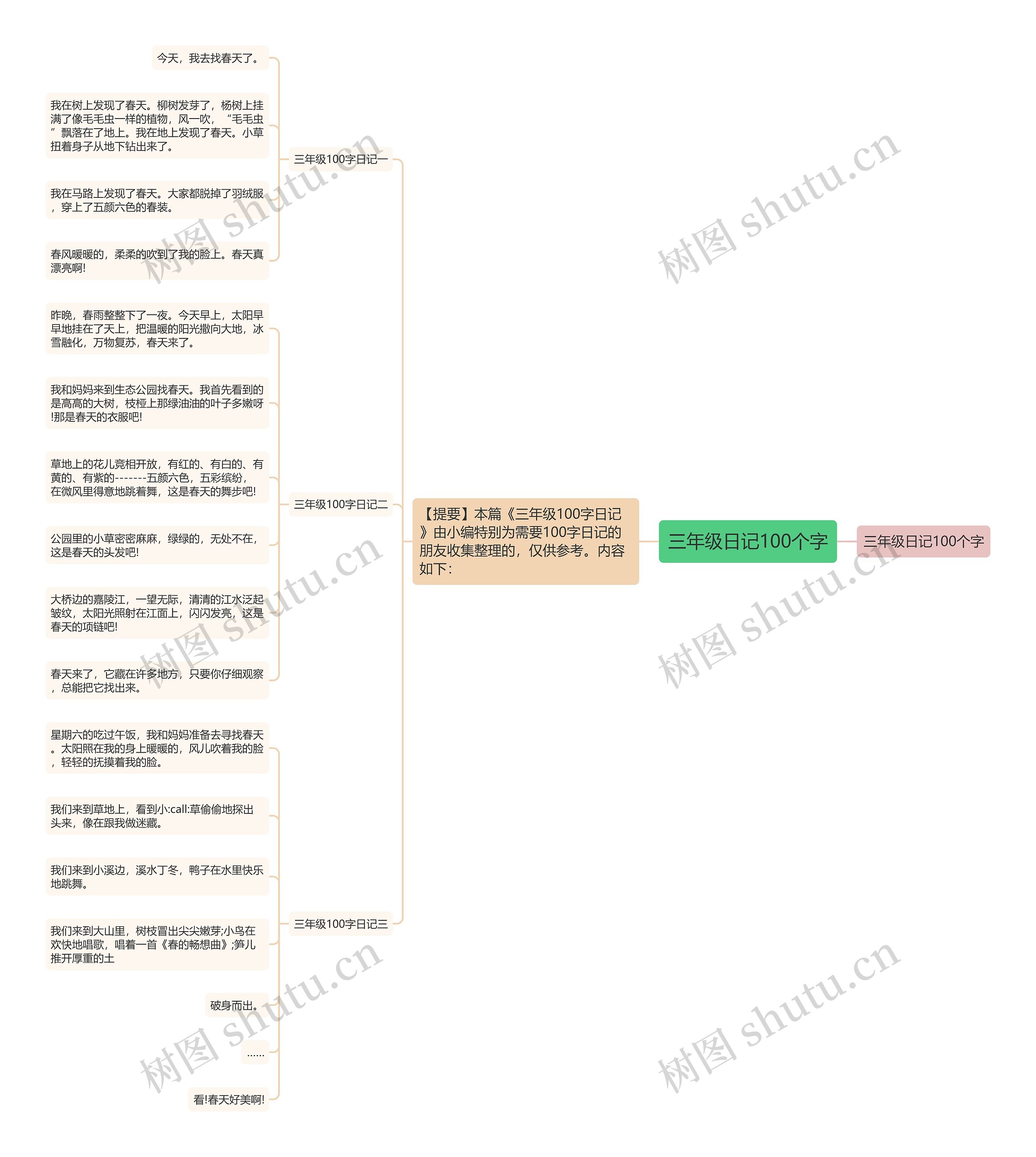 树图思维导图提供《三年级日记100个字》在线思维导图免费制作,点击“编辑”按钮,可对《三年级日记100个字》进行在线思维导图编辑,本思维导图属于思维导图模板主题,文件编号是:cc7afa13ca4529ff51ac57438d88373f