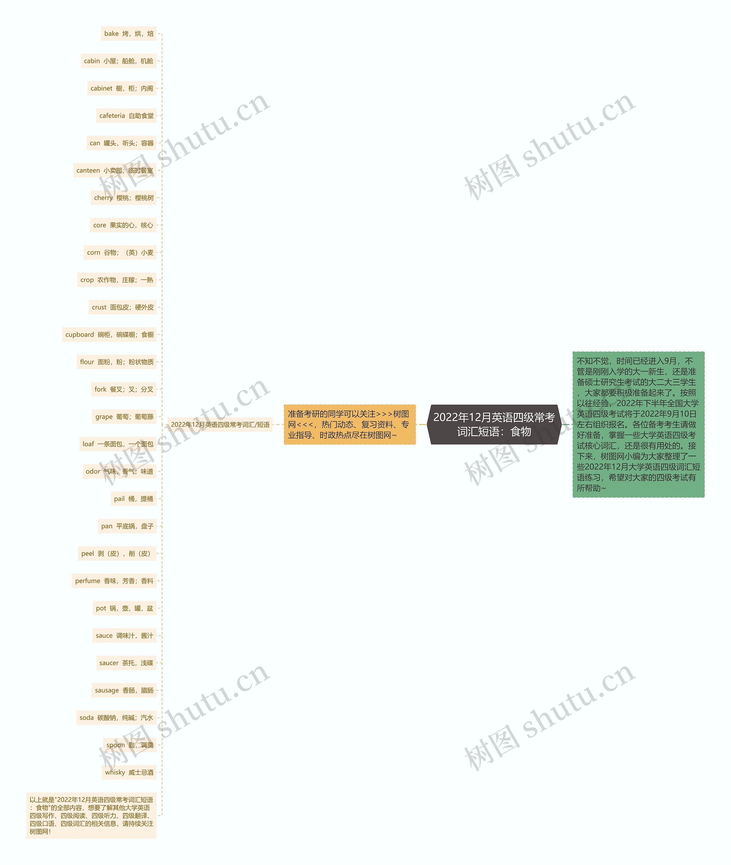 树图思维导图提供《2022年12月英语四级常考词汇短语:食物》在线思维导图免费制作,点击“编辑”按钮,可对《2022年12月英语四级常考词汇短语:食物》进行在线思维导图编辑,本思维导图属于思维导图模板主题,文件编号是:3df4f37a2d94818d224fc388ddb960bb