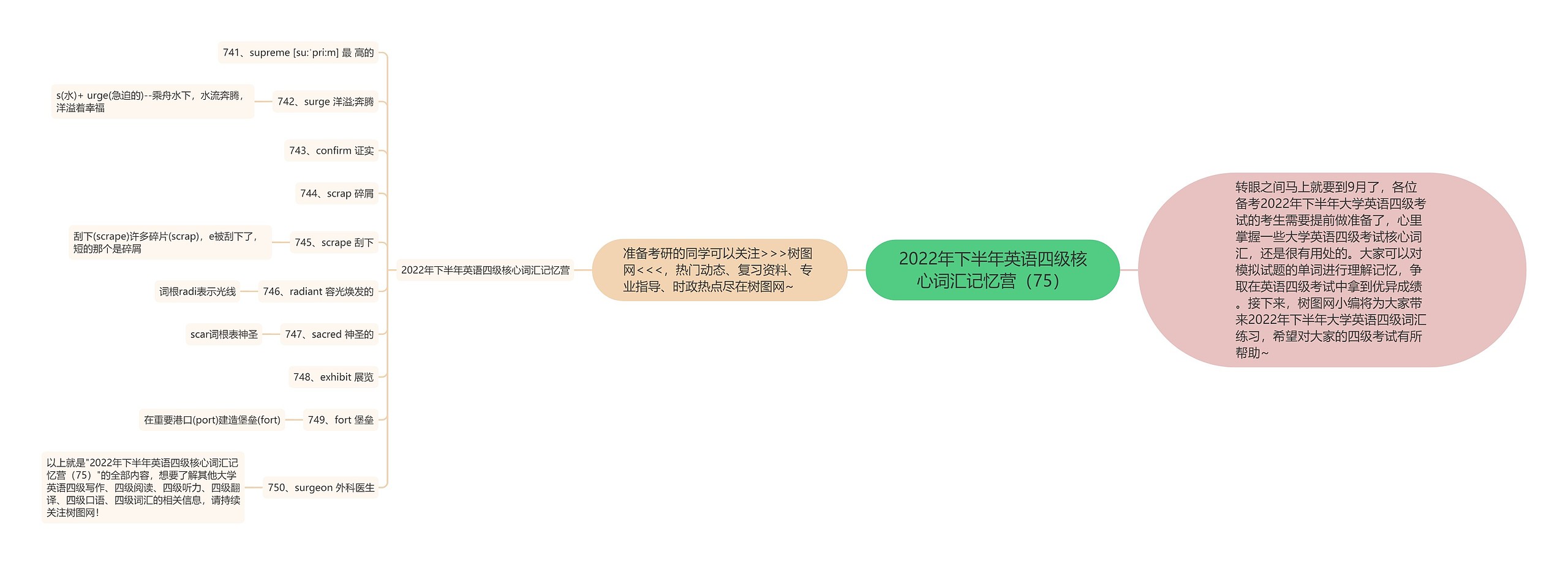 树图思维导图提供《2022年下半年英语四级核心词汇记忆营(75)》在线思维导图免费制作,点击“编辑”按钮,可对《2022年下半年英语四级核心词汇记忆营(75)》进行在线思维导图编辑,本思维导图属于思维导图模板主题,文件编号是:0ae57e90af6985a917ce20b6affdfbfc