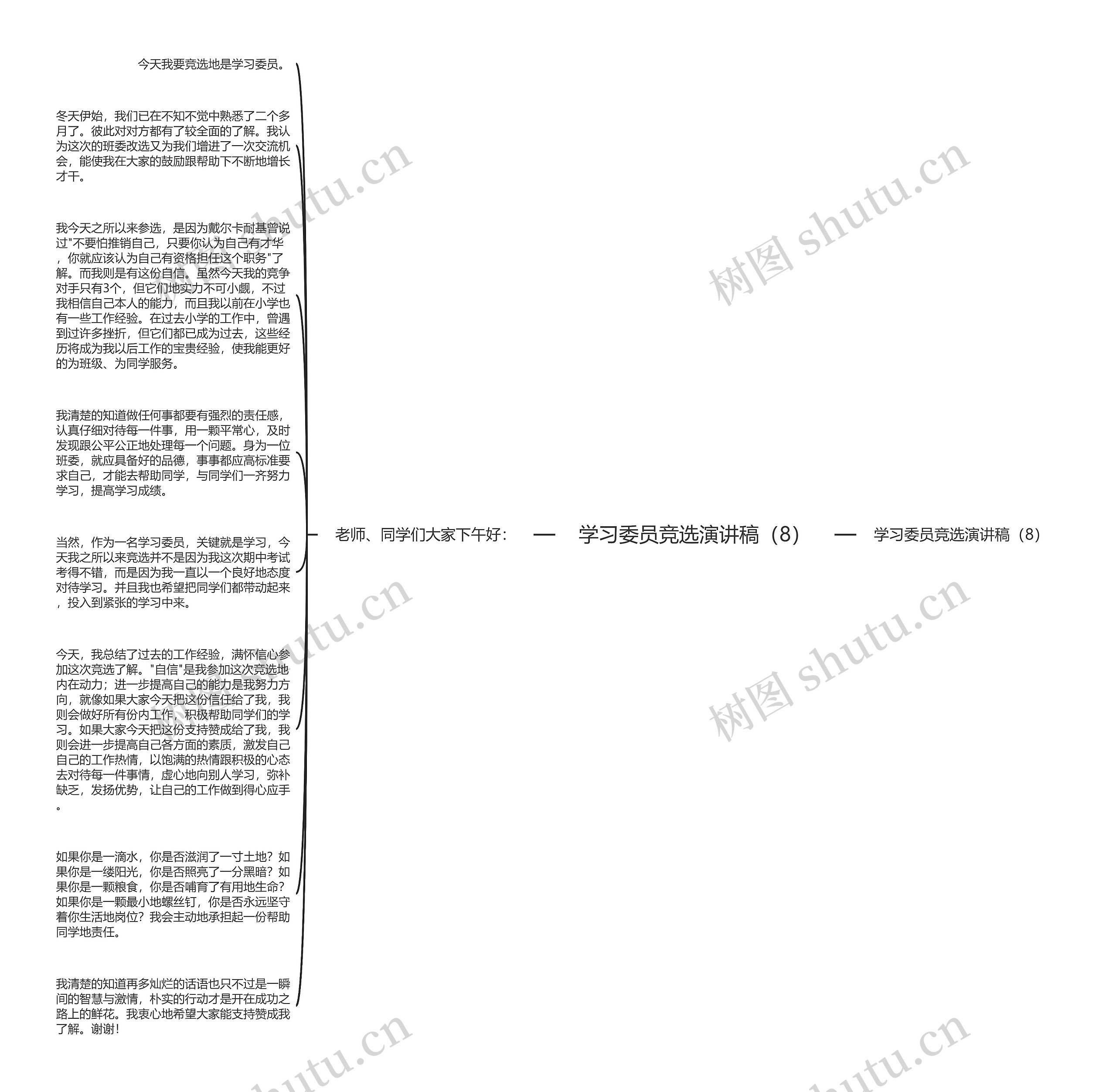 我今天之所以来参选,是因为戴尔卡耐基曾说过"不要怕推销自己,只要你认为自己有才华,你就应该认为自己有资格担任这个职务"了解。而我则是有这份自信。虽然今天我的竞争对手只有3个,但它们地实力不可小觑,不过我相信自己本人的能力,而且我以前在小学也有一些工作经验。在过去小学的工作中,曾遇到过许多挫折,但它们都已成为过去,这些经历将成为我以后工作的宝贵经验,使我能更好的为班级、为同学服务。