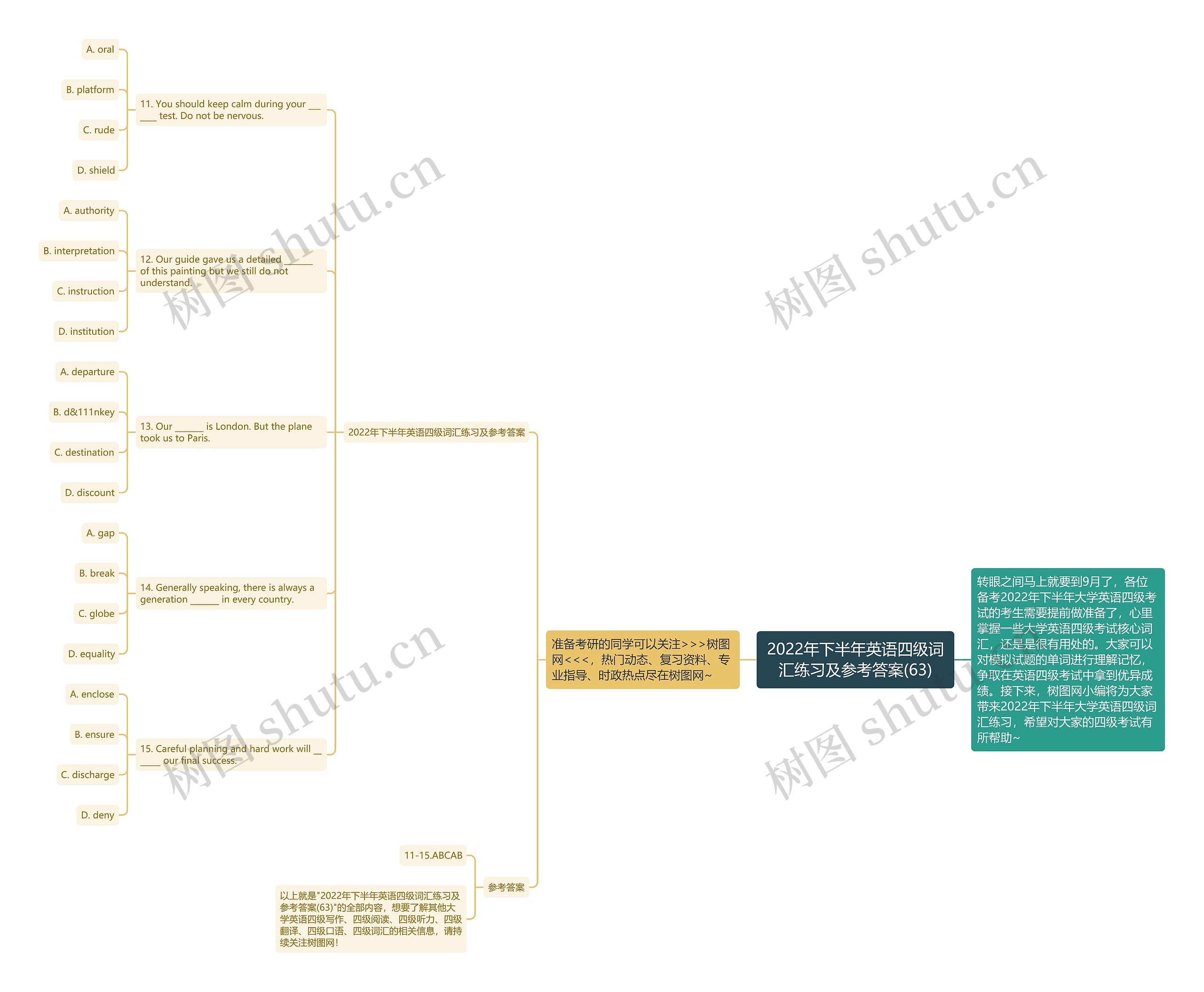 树图思维导图提供《2022年下半年英语四级词汇练习及参考答案(63)》在线思维导图免费制作,点击“编辑”按钮,可对《2022年下半年英语四级词汇练习及参考答案(63)》进行在线思维导图编辑,本思维导图属于思维导图模板主题,文件编号是:8f58c1a9a46e763ea462568ba43b40bf