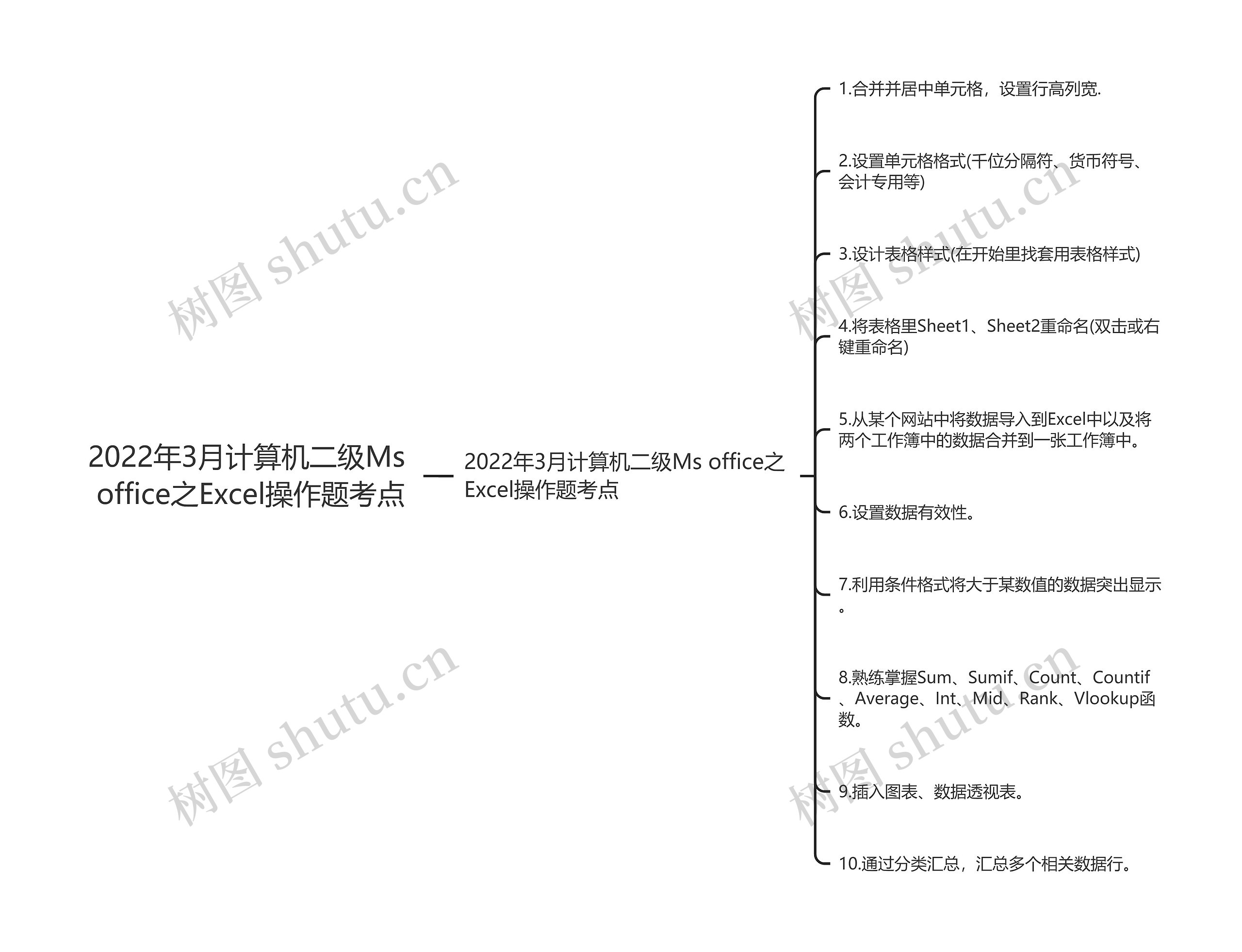 树图思维导图提供《2022年3月计算机二级Ms office之Excel操作题考点》在线思维导图免费制作,点击“编辑”按钮,可对《2022年3月计算机二级Ms office之Excel操作题考点》进行在线思维导图编辑,本思维导图属于思维导图模板主题,文件编号是:46152bd6b423d0de1c85bacc8610cc10