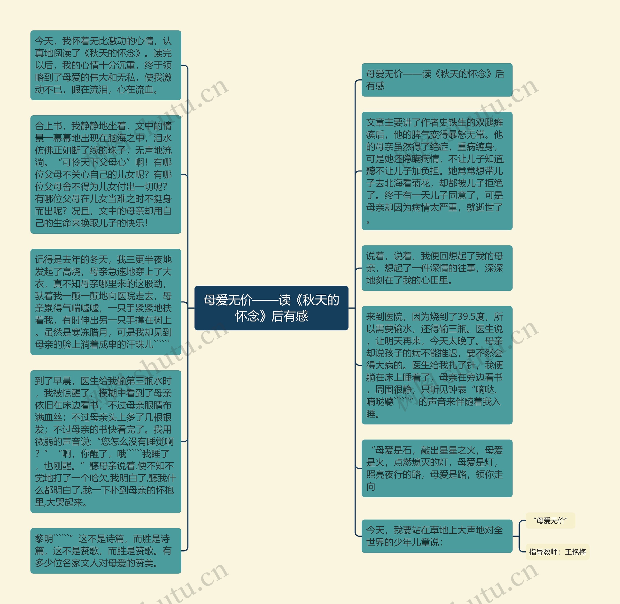 今天,我怀着无比激动的心情,认真地阅读了《秋天的怀念》。读完以后,我的心情十分沉重,终于领略到了母爱的伟大和无私,使我激动不已,眼在流泪,心在流血。