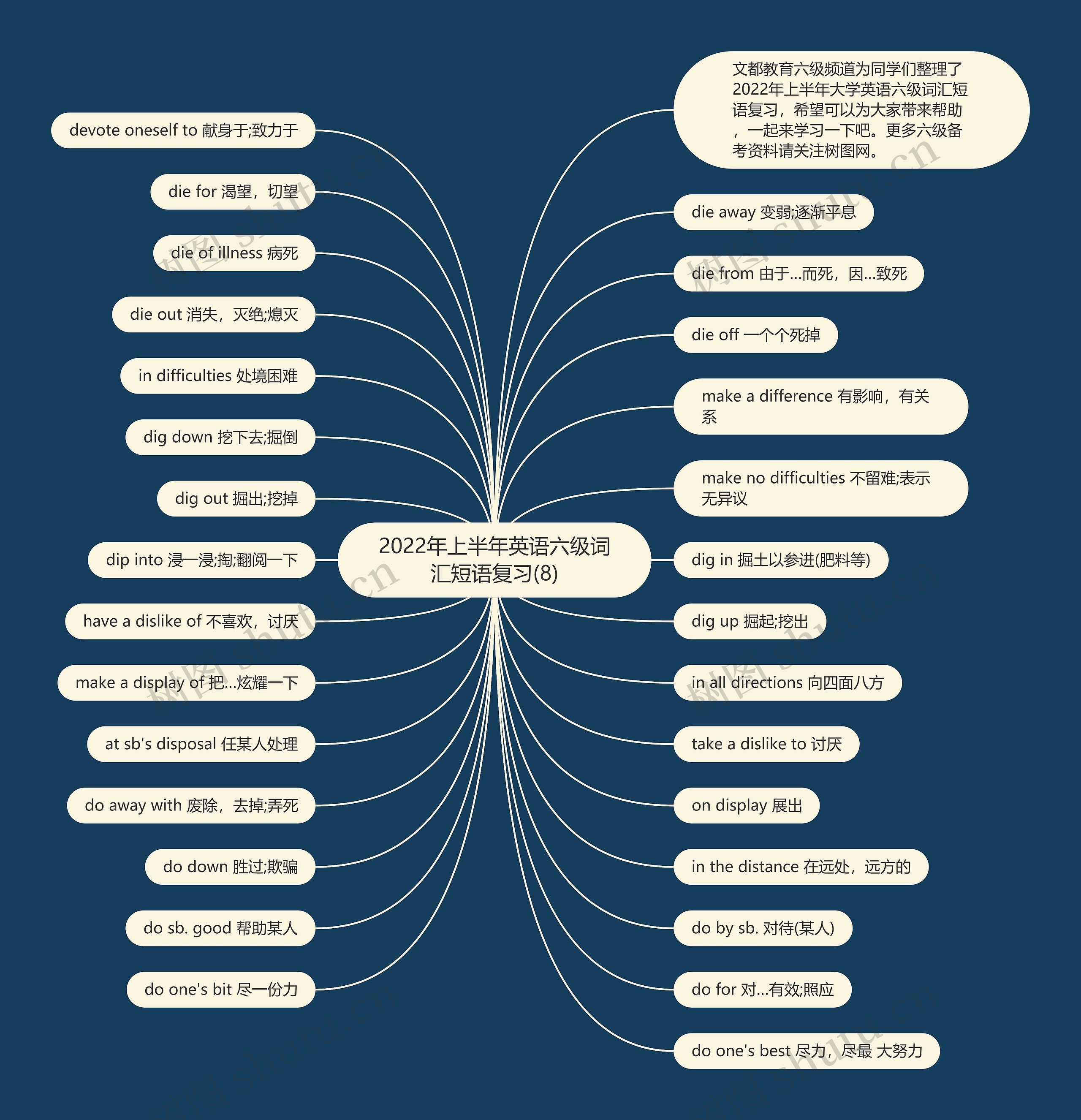 树图思维导图提供《2022年上半年英语六级词汇短语复习(8)》在线思维导图免费制作,点击“编辑”按钮,可对《2022年上半年英语六级词汇短语复习(8)》进行在线思维导图编辑,本思维导图属于思维导图模板主题,文件编号是:c65de6f04f4ea2ba00667e7cb0af6d31