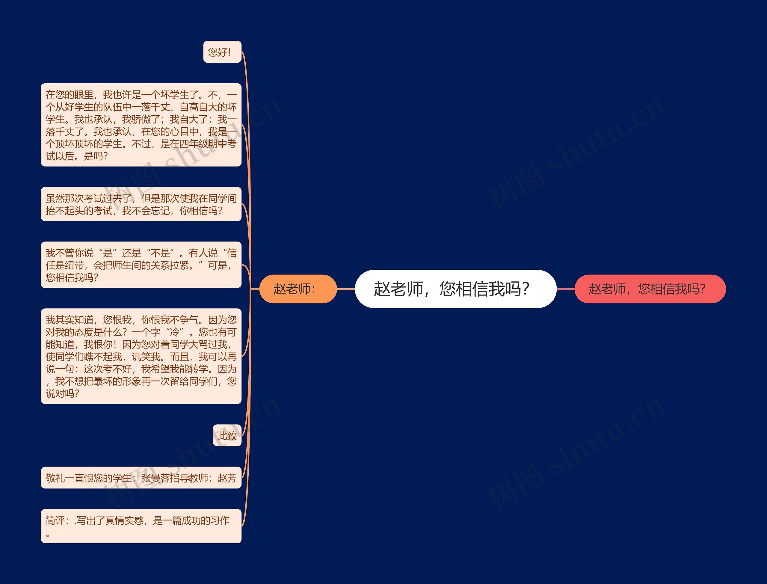树图思维导图提供《赵老师,您相信我吗?》在线思维导图免费制作,点击“编辑”按钮,可对《赵老师,您相信我吗?》进行在线思维导图编辑,本思维导图属于思维导图模板主题,文件编号是:9bda22fe7f80a96540cd45a04631a747