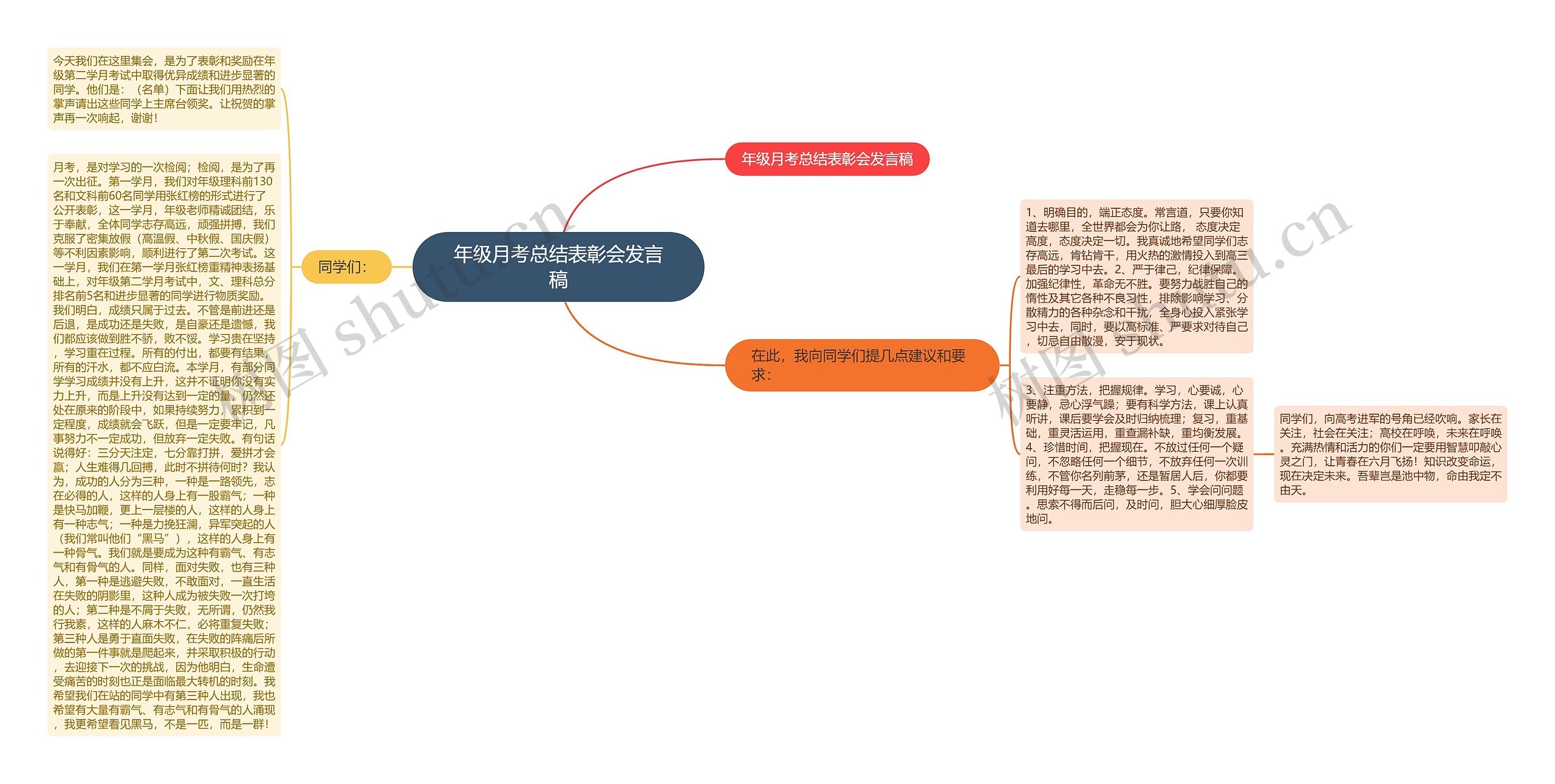 树图思维导图提供《年级月考总结表彰会发言稿》在线思维导图免费制作,点击“编辑”按钮,可对《年级月考总结表彰会发言稿》进行在线思维导图编辑,本思维导图属于思维导图模板主题,文件编号是:2b420a45c92b5df5bd75110ba41b2fc8