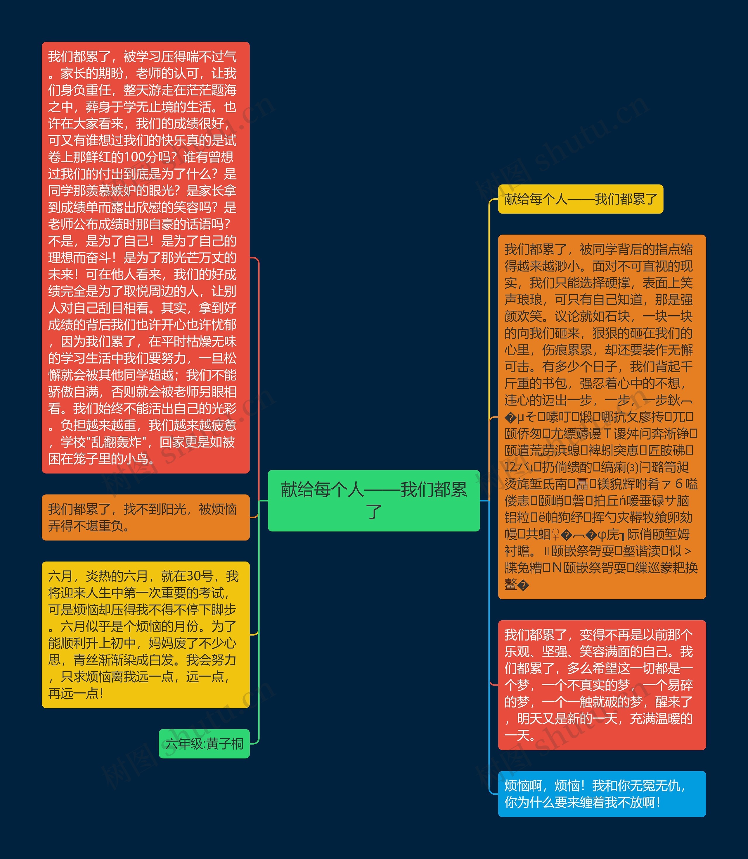 我们都累了,被学习压得喘不过气。家长的期盼,老师的认可,让我们身负重任,整天游走在茫茫题海之中,葬身于学无止境的生活。也许在大家看来,我们的成绩很好,可又有谁想过我们的快乐真的是试卷上那鲜红的100分吗?谁有曾想过我们的付出到底是为了什么?是同学那羡慕嫉妒的眼光?是家长拿到成绩单而露出欣慰的笑容吗?是老师公布成绩时那自豪的话语吗?不是,是为了自己!是为了自己的理想而奋斗!是为了那光芒万丈的未来!可在他人看来,我们的好成绩完全是为了取悦周边的人,让别人对自己刮目相看。其实,拿到好成绩的背后我们也许开心也许忧郁,因为我们累了,在平时枯燥无味的学习生活中我们要努力,一旦松懈就会被其他同学超越;我们不能骄傲自满,否则就会被老师另眼相看。我们始终不能活出自己的光彩。负担越来越重,我们越来越疲惫,学校"乱翻轰炸",回家更是如被困在笼子里的小鸟。