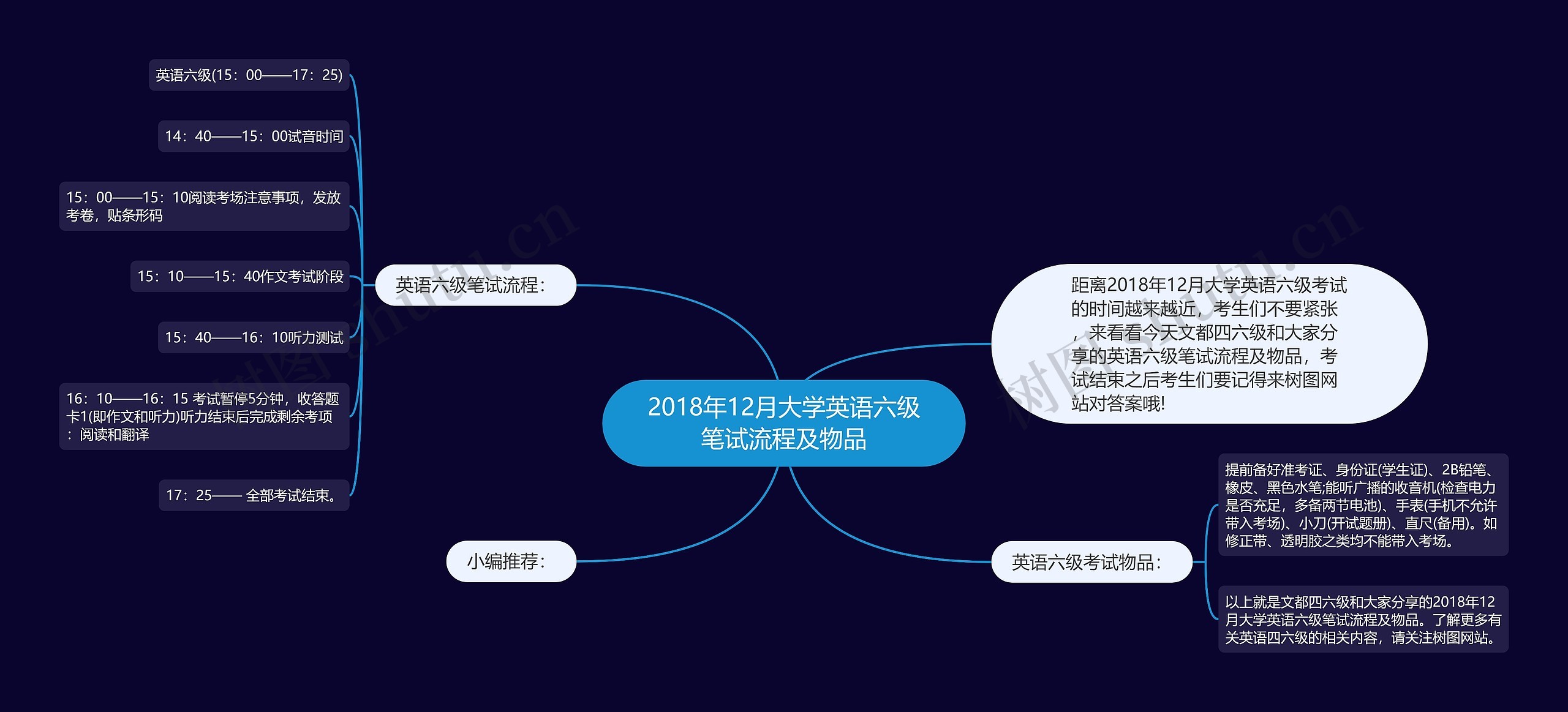 树图思维导图提供《2018年12月大学英语六级笔试流程及物品》在线思维导图免费制作,点击“编辑”按钮,可对《2018年12月大学英语六级笔试流程及物品》进行在线思维导图编辑,本思维导图属于思维导图模板主题,文件编号是:9ebd13ae4e647a9242a57e536539acac