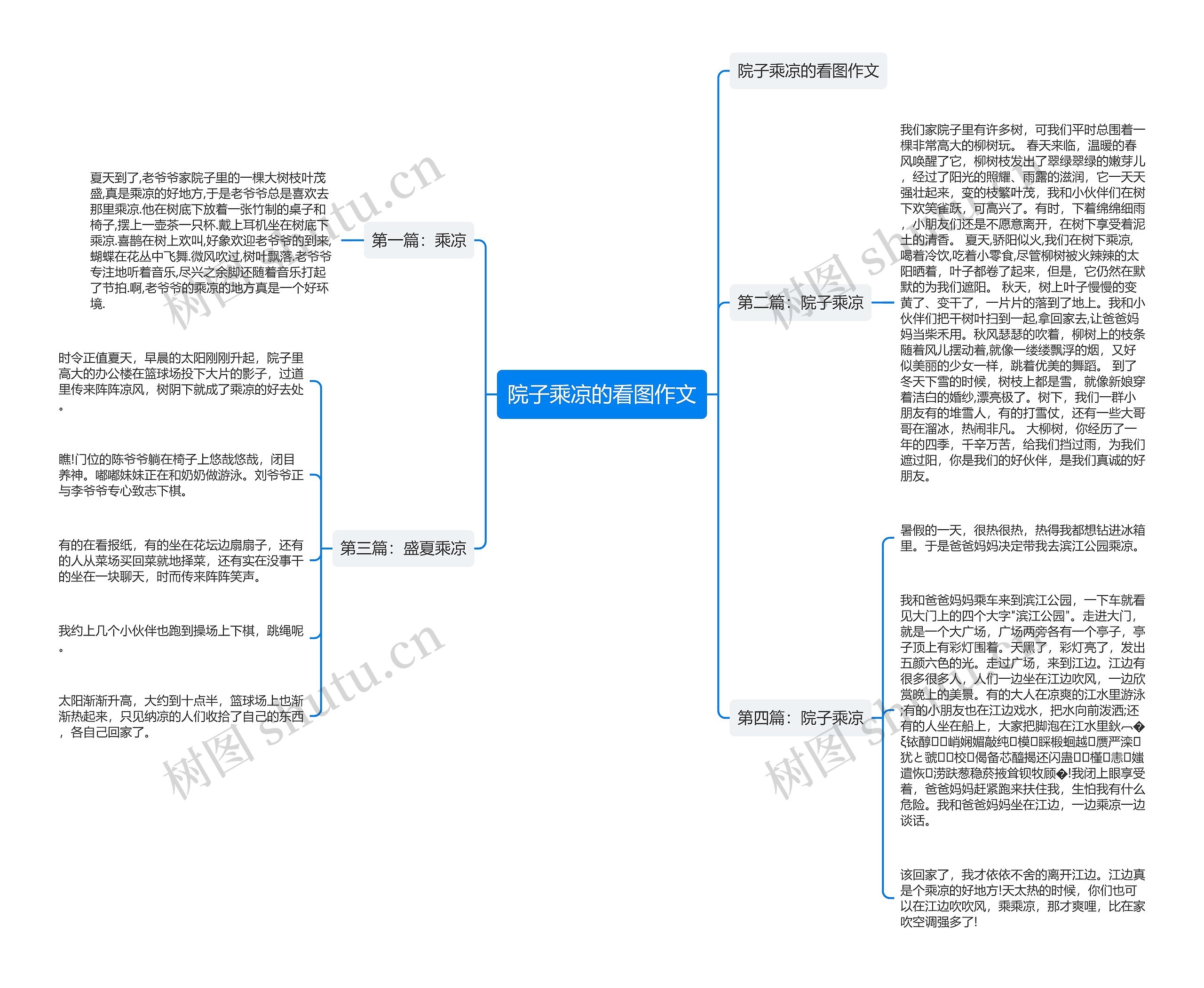 树图思维导图提供《院子乘凉的看图作文》在线思维导图免费制作,点击“编辑”按钮,可对《院子乘凉的看图作文》进行在线思维导图编辑,本思维导图属于思维导图模板主题,文件编号是:8490ed7b6f71fa21fe8ffaf0694a13f6