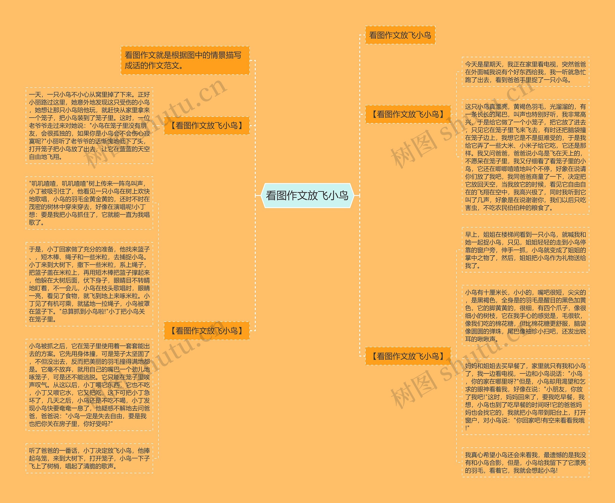 "叽叽喳喳,叽叽喳喳"树上传来一阵鸟叫声,小丁被吸引住了,他看见一只小鸟在树上欢快地歌唱,小鸟的羽毛金黄金黄的,还时不时在茂密的树林中穿来穿去,好像在演唱呢!小丁想:要是我把小鸟抓住了,它就能一直为我唱歌了。