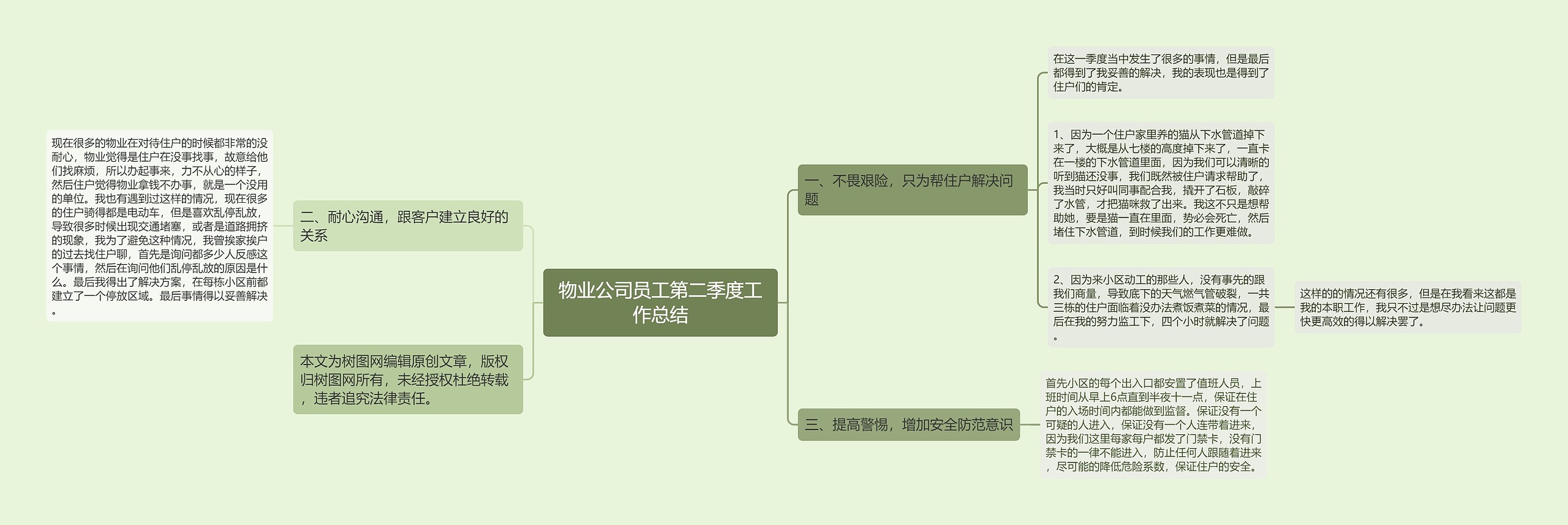 树图思维导图提供《物业公司员工第二季度工作总结》在线思维导图免费制作,点击“编辑”按钮,可对《物业公司员工第二季度工作总结》进行在线思维导图编辑,本思维导图属于思维导图模板主题,文件编号是:267141a2ab9dd2943879723f62b2ec39