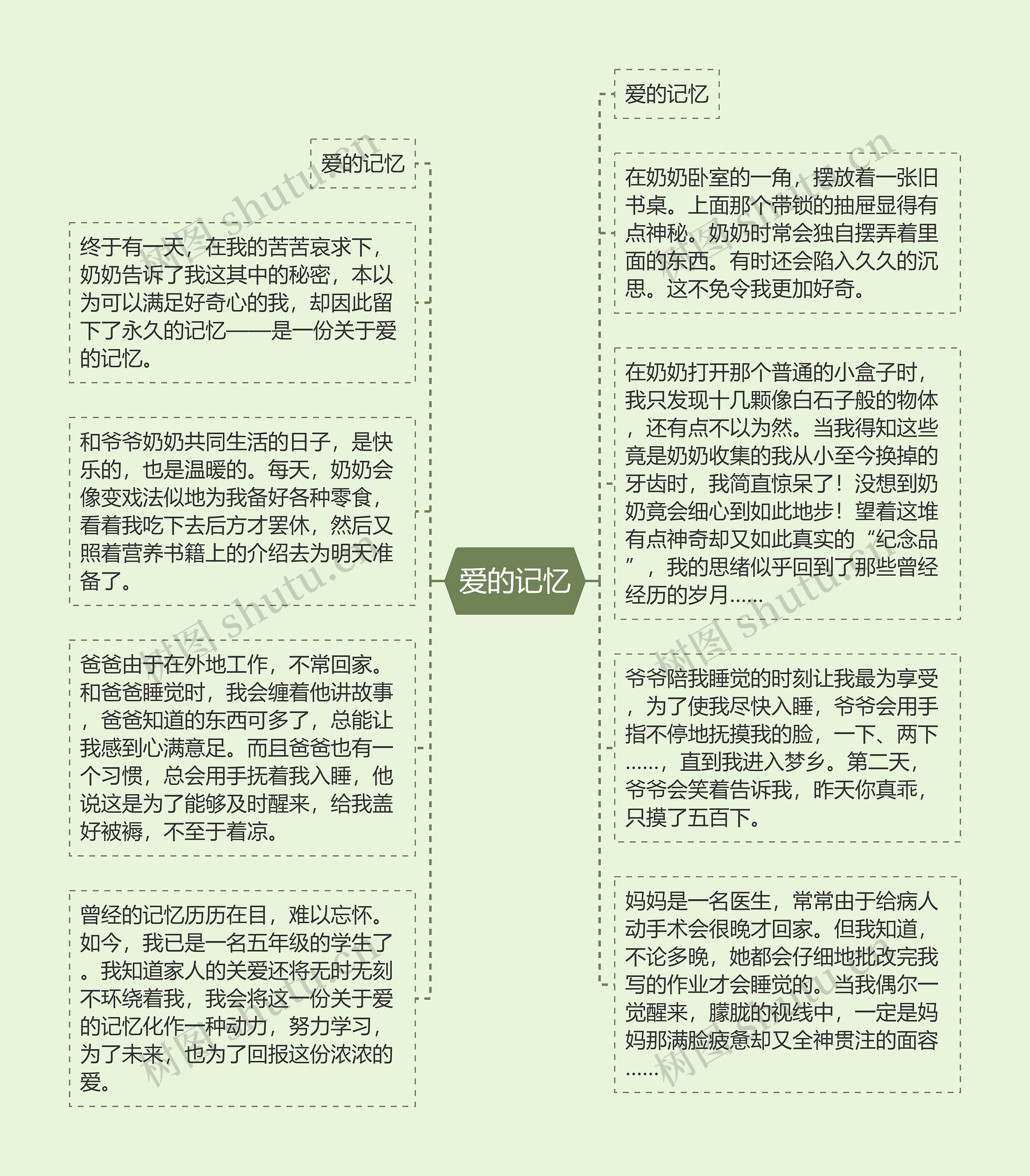 曾经的记忆历历在目,难以忘怀。如今,我已是一名五年级的学生了。我知道家人的关爱还将无时无刻不环绕着我,我会将这一份关于爱的记忆化作一种动力,努力学习,为了未来,也为了回报这份浓浓的爱。