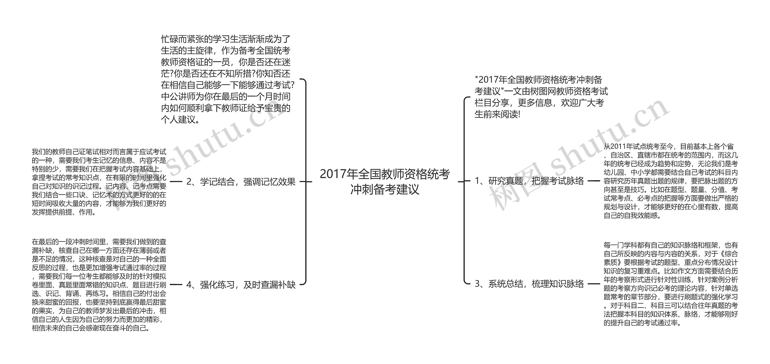 树图思维导图提供《2017年全国教师资格统考冲刺备考建议》在线思维导图免费制作,点击“编辑”按钮,可对《2017年全国教师资格统考冲刺备考建议》进行在线思维导图编辑,本思维导图属于思维导图模板主题,文件编号是:3230e2b91fbebd21764c1eab03af67b6
