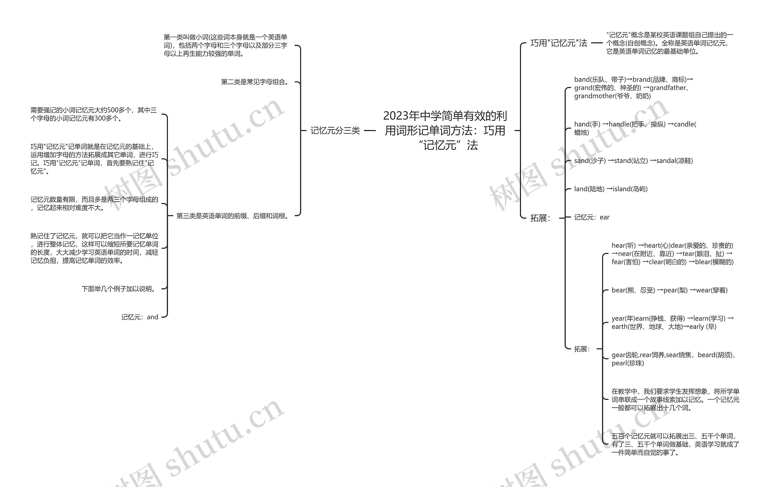 树图思维导图提供《2023年中学简单有效的利用词形记单词方法:巧用“记忆元”法》在线思维导图免费制作,点击“编辑”按钮,可对《2023年中学简单有效的利用词形记单词方法:巧用“记忆元”法》进行在线思维导图编辑,本思维导图属于思维导图模板主题,文件编号是:430401946ac26ba88963ec92f86392bd