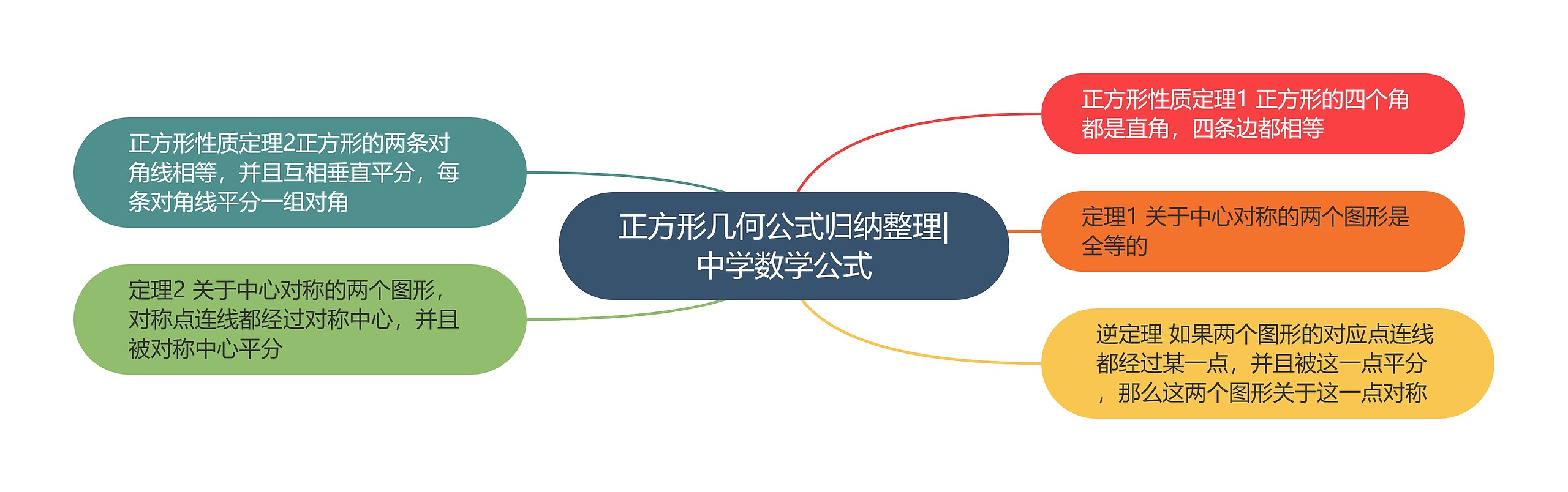 「正方形几何公式归纳整理|中学数学公式思维导图」模板展示了几何中和正方形相关的几个定理和公式,正方形的性质定理1指出正方形的四个角都是直角,四条边都相等,定理2则告诉我们,正方形的两条对角线相等,互相垂直平分,每条对角线平分一组对角,关于中心对称的两个图形全的定理1,和关于中心对称的两个图形,对称点连线都经过对称中心并对称中心平分的定理2,逆定理则告诉我们,如果两个图形的对应点连线都经过某一点,被这一点平分,那么这两个图形关于这一点对称。