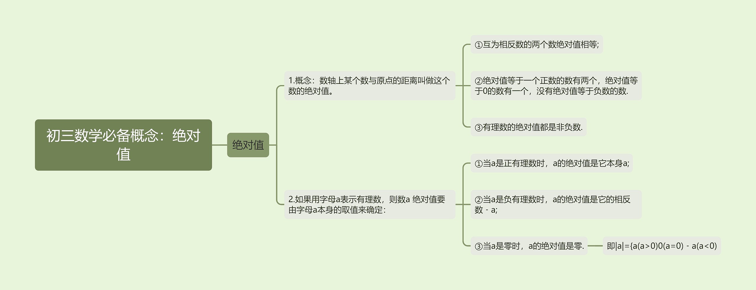 初三数学必备概念:绝对值思维导图,绝对值为数轴上某数与原点距离,互为相反数的绝对值相等,绝对值等于正数有两个,等于0的有1个,没有绝对值等于负数的,有理数的绝对值都是非负数,用字母a表示有理数,a的绝对值为a本身(a>0),为相反数-a(a<0),为0(a=0)。