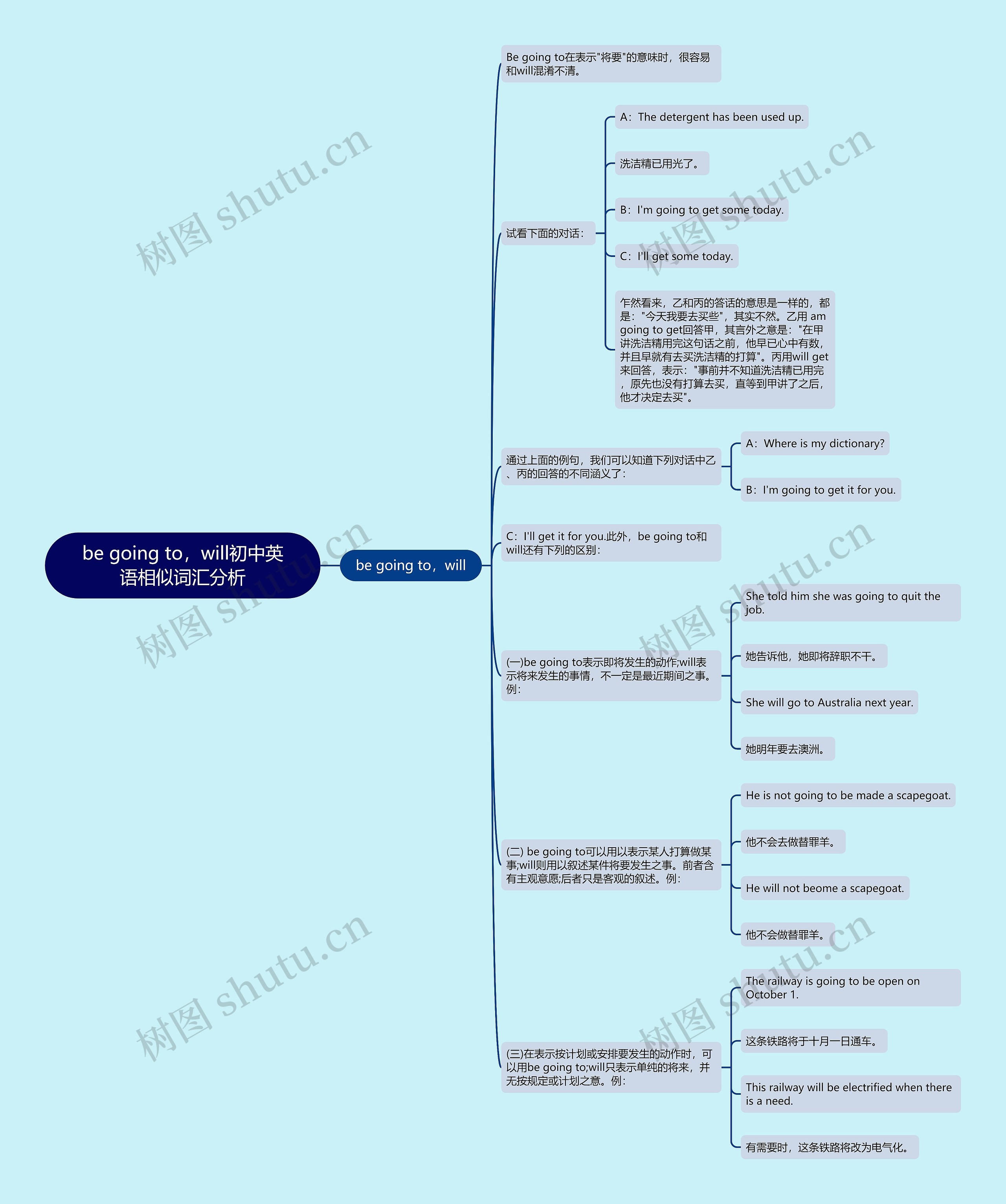 乍然看来,乙和丙的答话的意思是一样的,都是:"今天我要去买些",其实不然。乙用 am going to get回答甲,其言外之意是:"在甲讲洗洁精用完这句话之前,他早已心中有数,并且早就有去买洗洁精的打算"。丙用will get来回答,表示:"事前并不知道洗洁精已用完,原先也没有打算去买,直等到甲讲了之后,他才决定去买"。