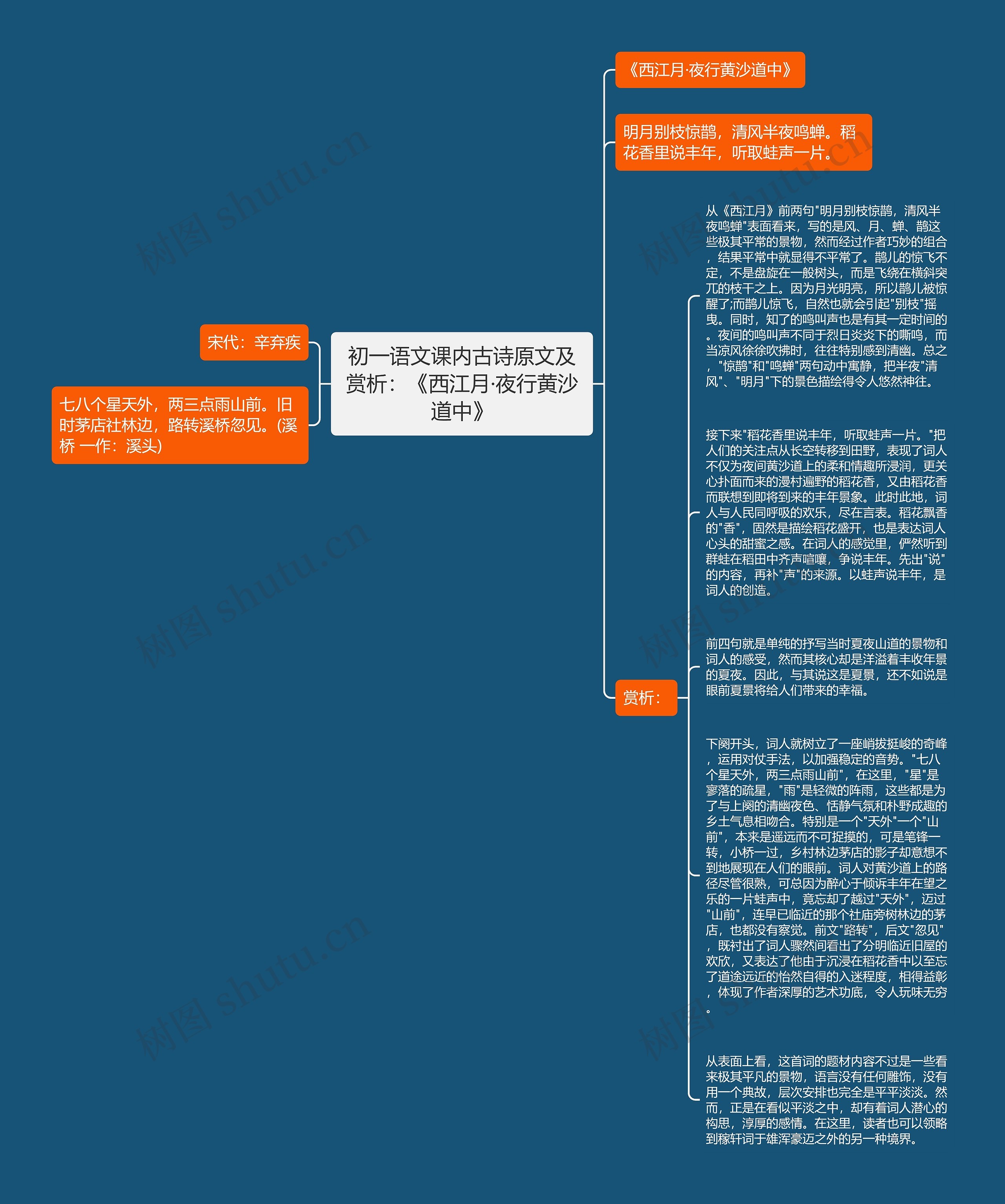 从《西江月》前两句"明月别枝惊鹊,清风半夜鸣蝉"表面看来,写的是风、月、蝉、鹊这些极其平常的景物,然而经过作者巧妙的组合,结果平常中就显得不平常了。鹊儿的惊飞不定,不是盘旋在一般树头,而是飞绕在横斜突兀的枝干之上。因为月光明亮,所以鹊儿被惊醒了;而鹊儿惊飞,自然也就会引起"别枝"摇曳。同时,知了的鸣叫声也是有其一定时间的。夜间的鸣叫声不同于烈日炎炎下的嘶鸣,而当凉风徐徐吹拂时,往往特别感到清幽。总之,"惊鹊"和"鸣蝉"两句动中寓静,把半夜"清风"、"明月"下的景色描绘得令人悠然神往。